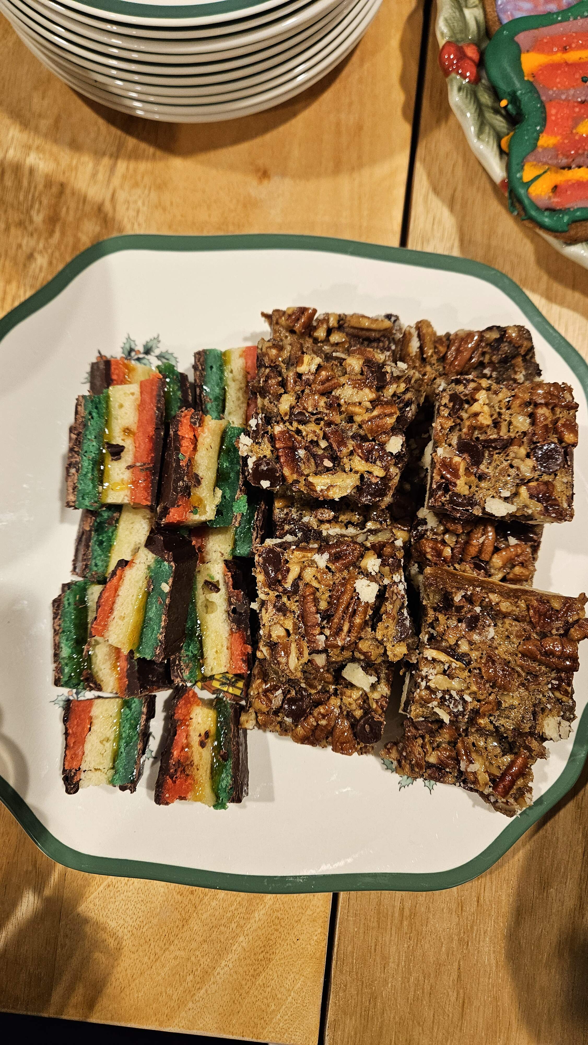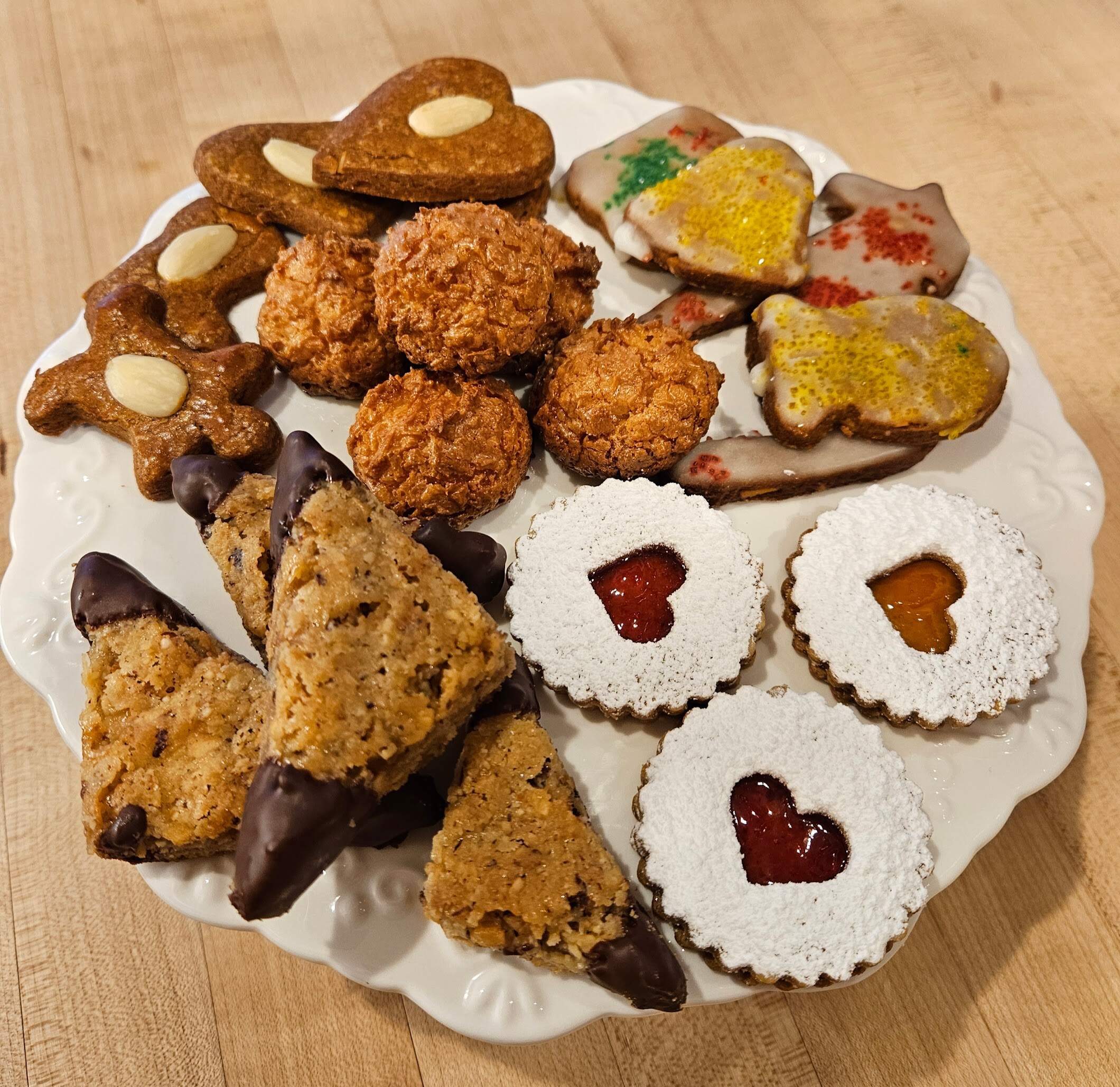 Traditional cookie plate: From top left: honigkuchen plain, honigkuchen lemon iced, linzer cookies, nussecken, coconut rochers in the middle. Tomorrow there will be old school Christmas cake and a steamed pudding. Happy Christmas!
