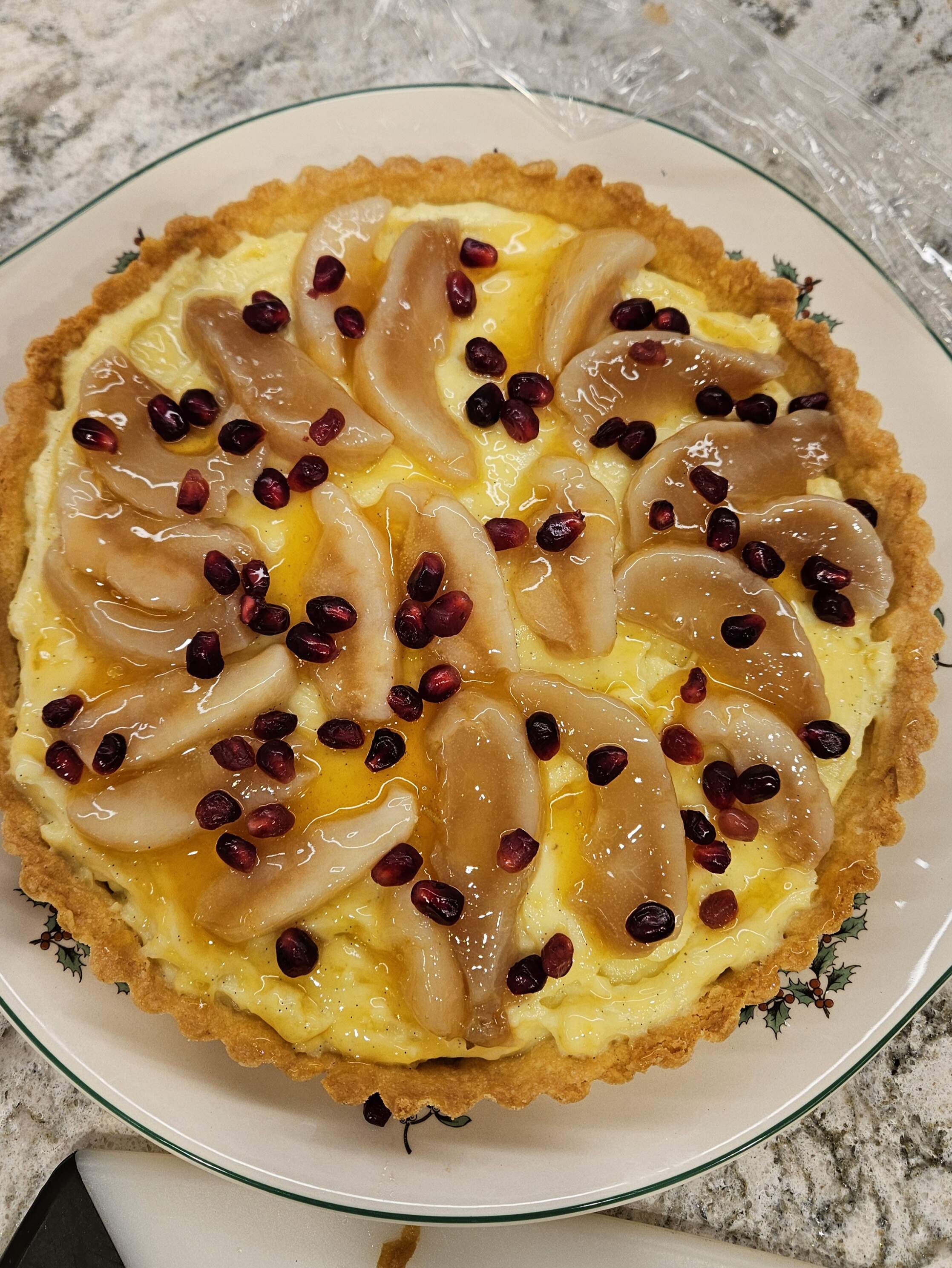 Pear tart turned out well. The pears oxidized a little despite the lemon juice used to thwart it and I over-poached them a bit. However we all loved it. I’ll do it with different fruit next time.