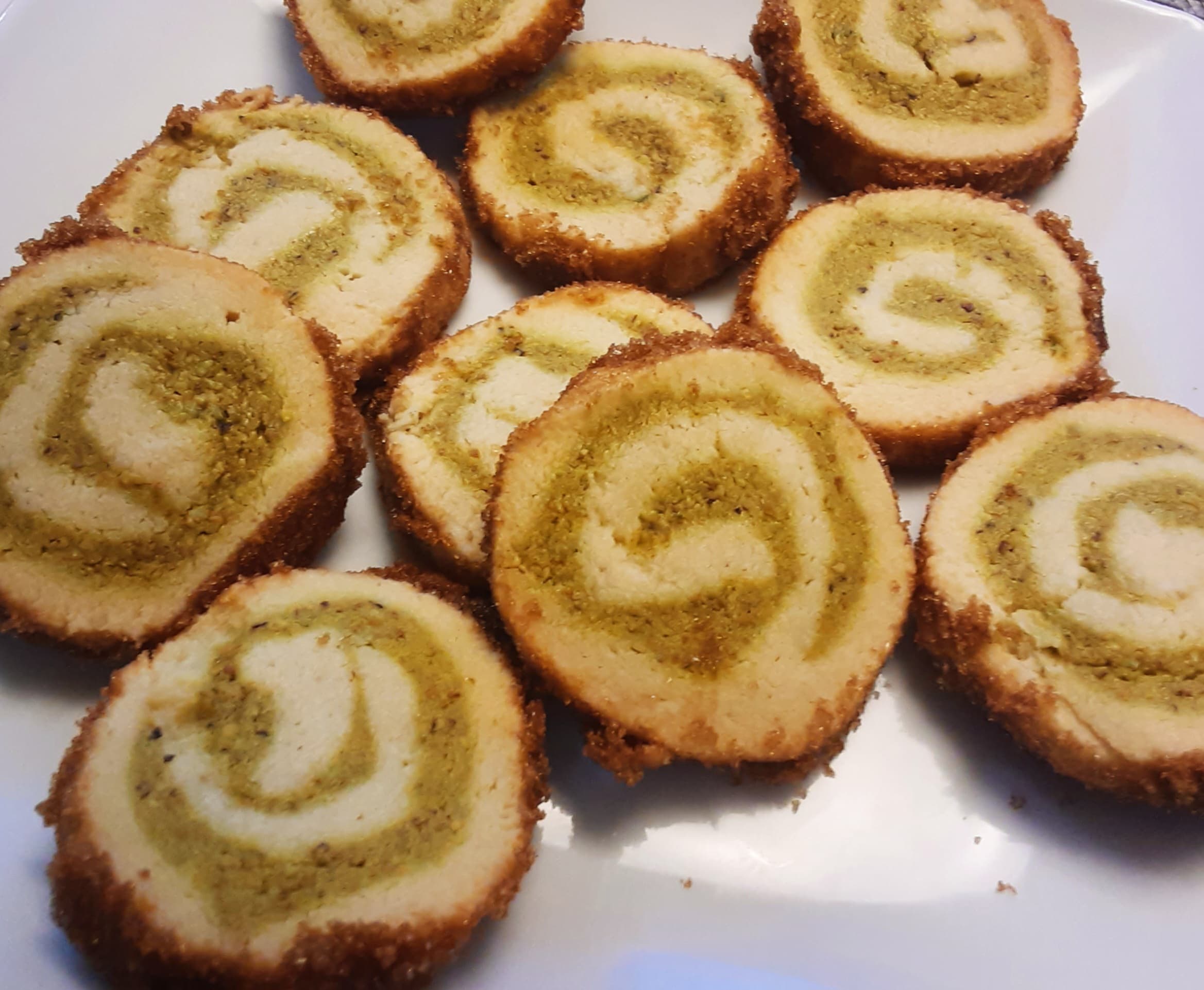 Pistachio Pinwheels. They are buttery, nutty shortbreads. The main dough conta8ns almond flour and the swirl paste is made from gro7nd pistacios. The swirl is really green. This one has been on my bucket list for a long time. Loved my sample.