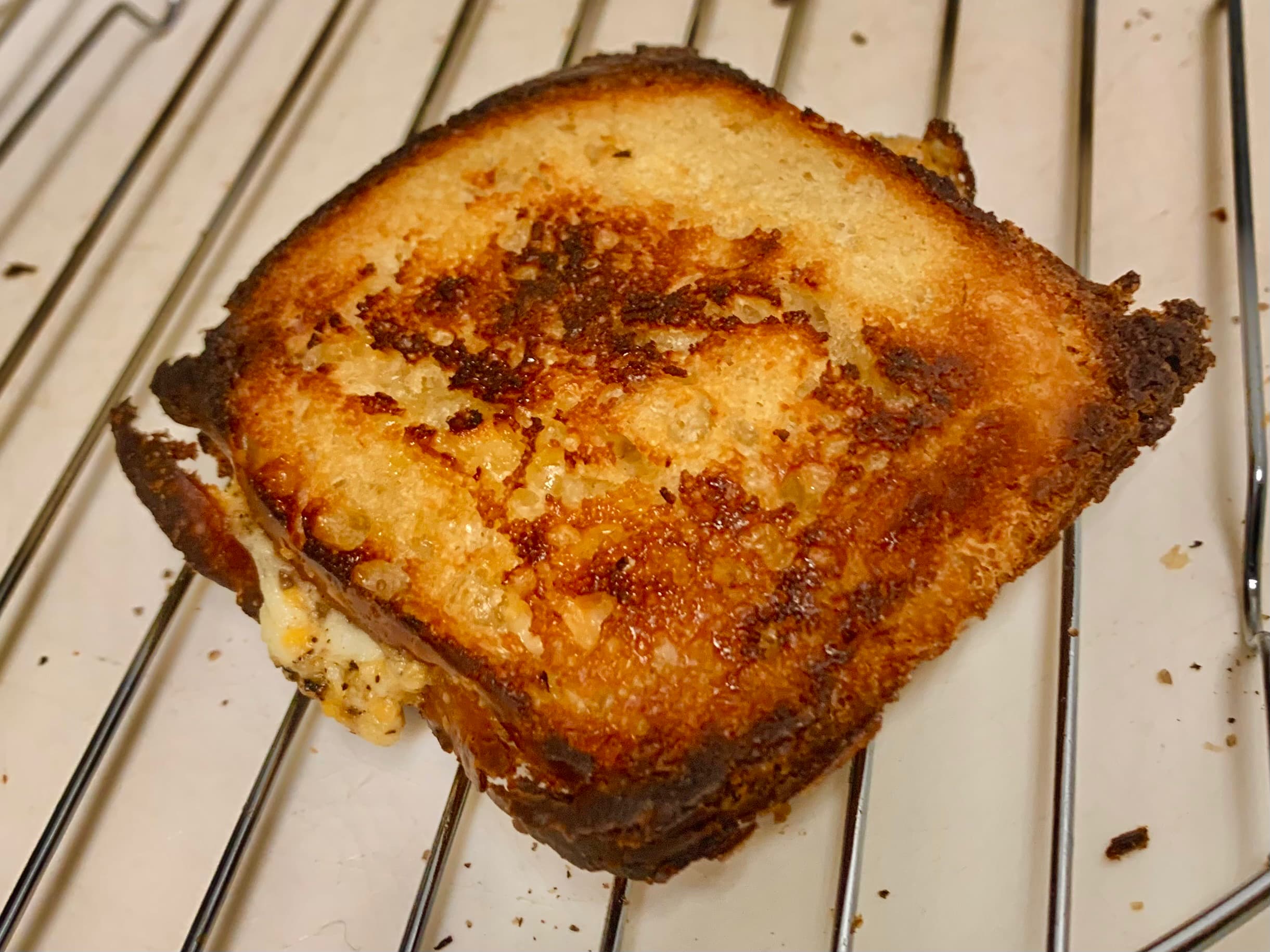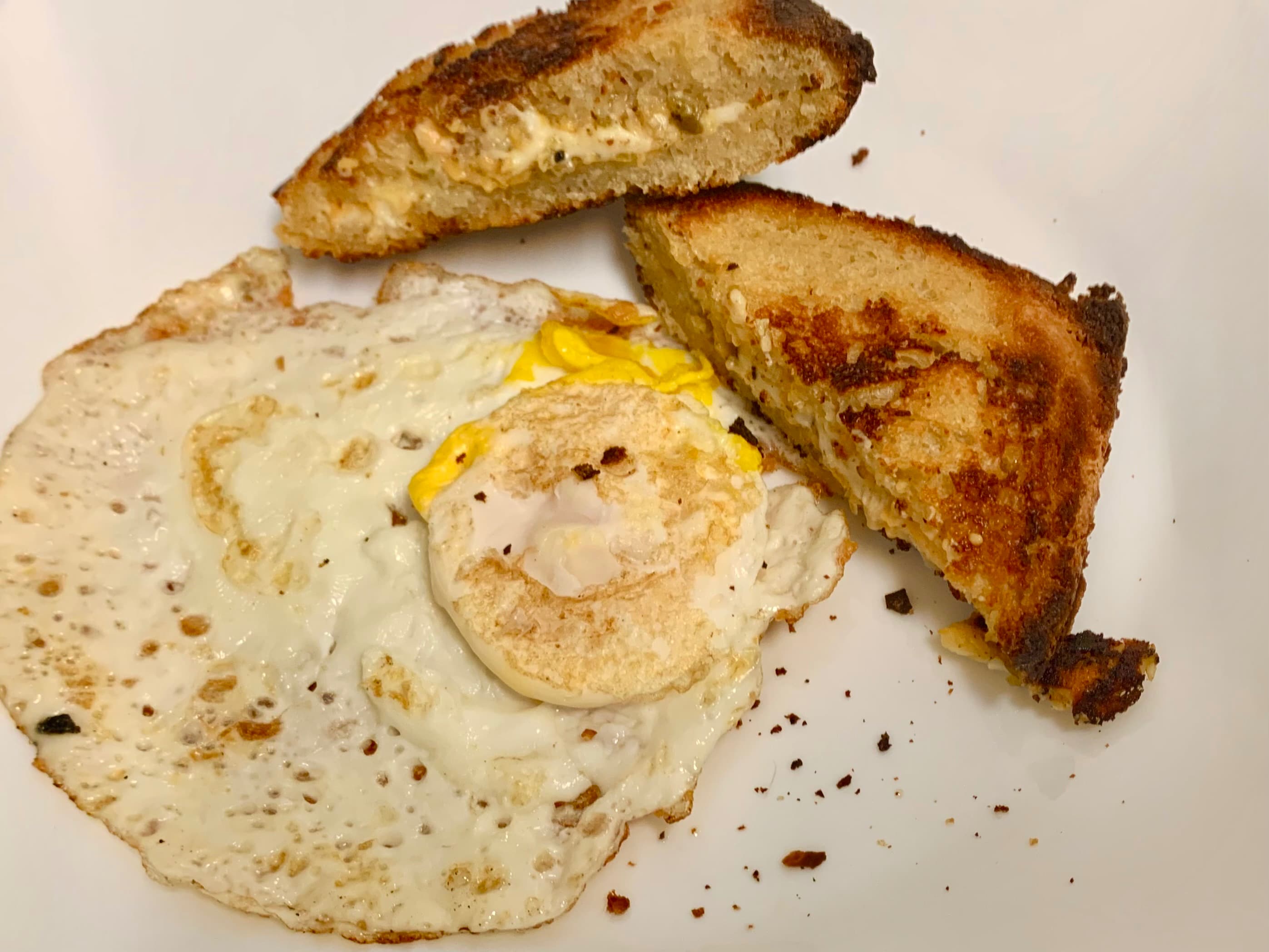 Cheestoast / grilled cheese with the dregs of the Kenai / cheddar jalapeno dip plus more cheddar, and a frico fried egg with parmesan.