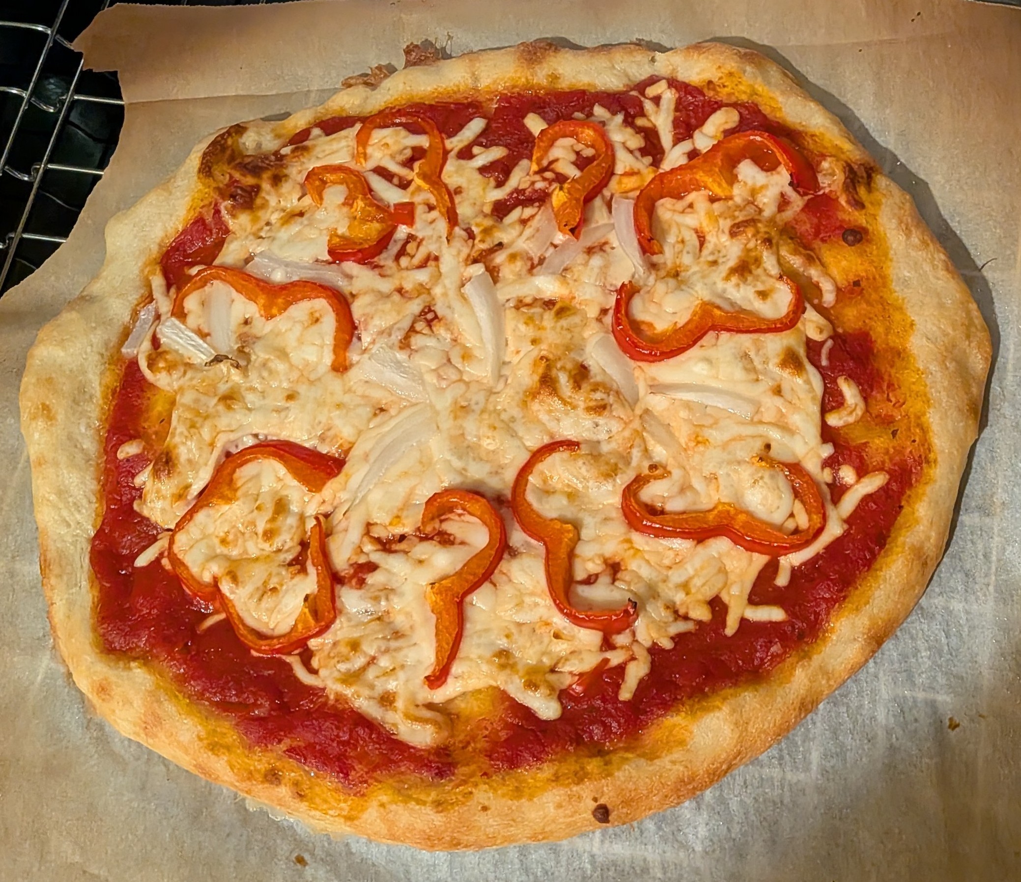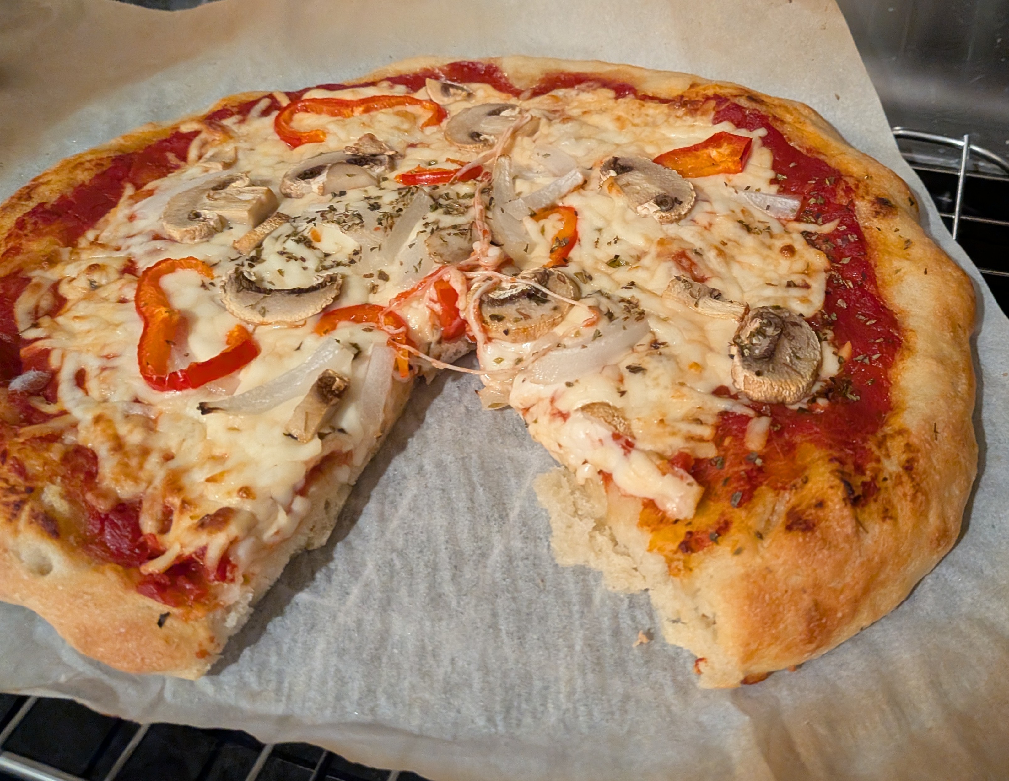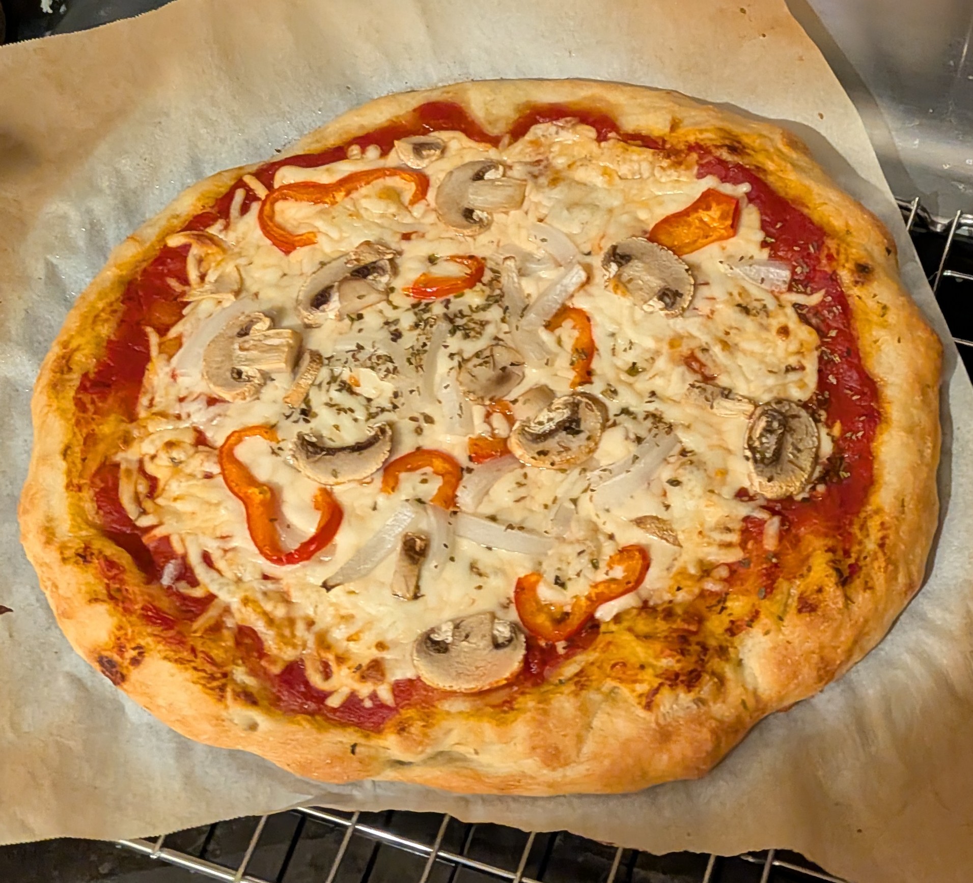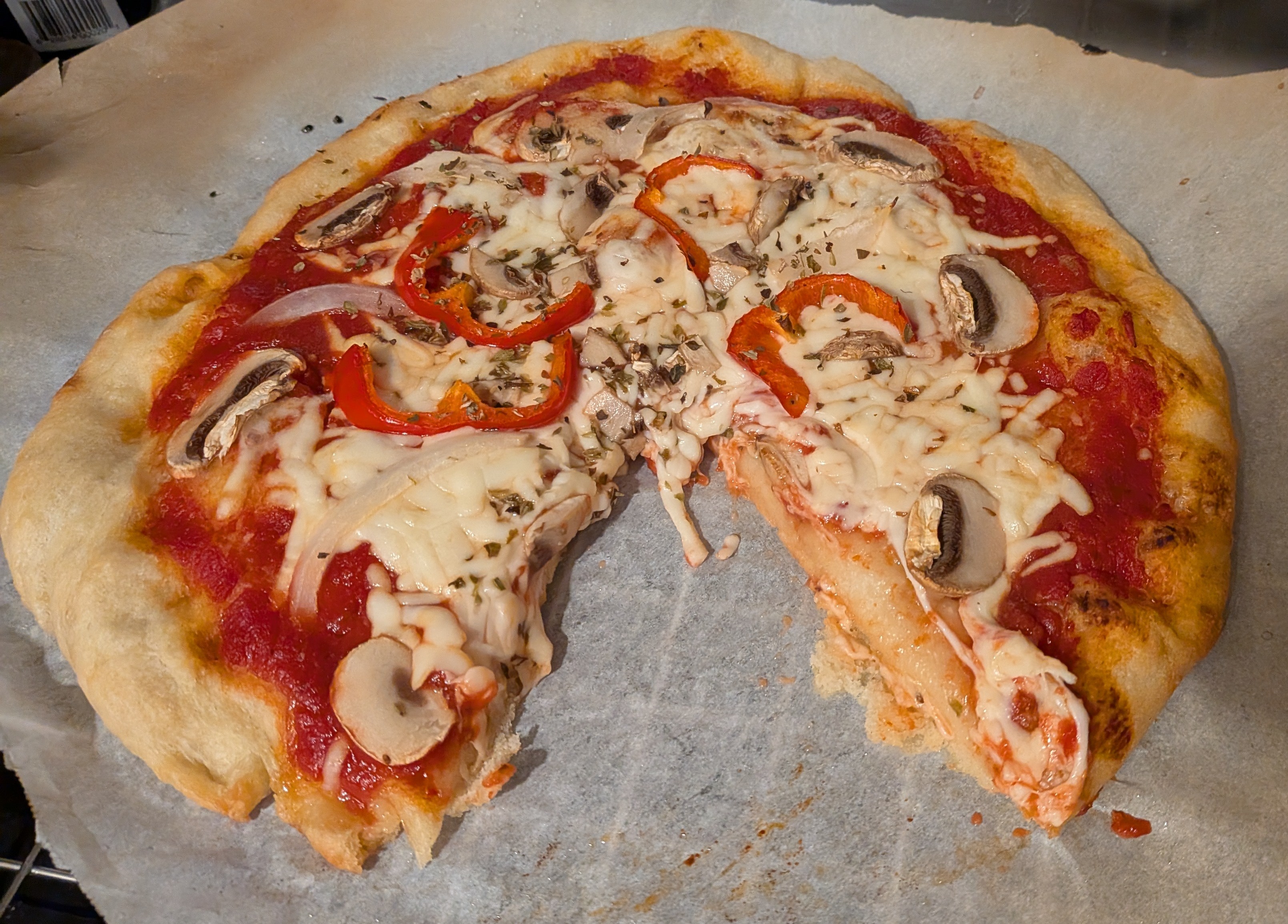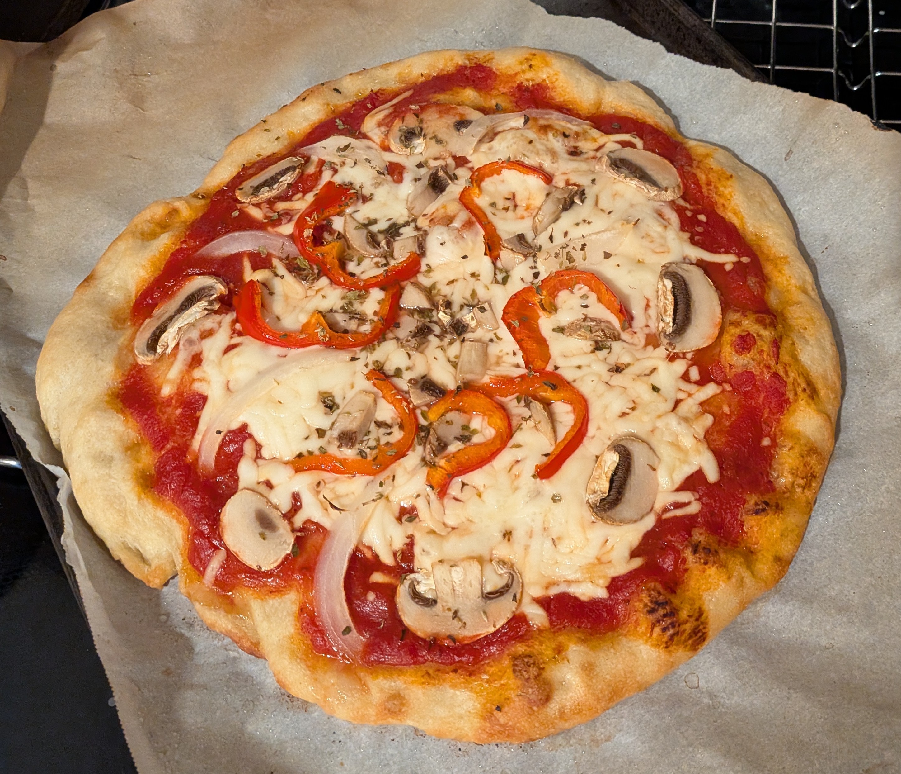 I used Mutti Pizza Sauce that comes in a can. It costs around $4.99 CAD. We liked it as much as Rao’s pizza sauce and it’s half the price per ml. The toppings were sweet onion, red Shepherd pepper, white mushrooms and oregano.