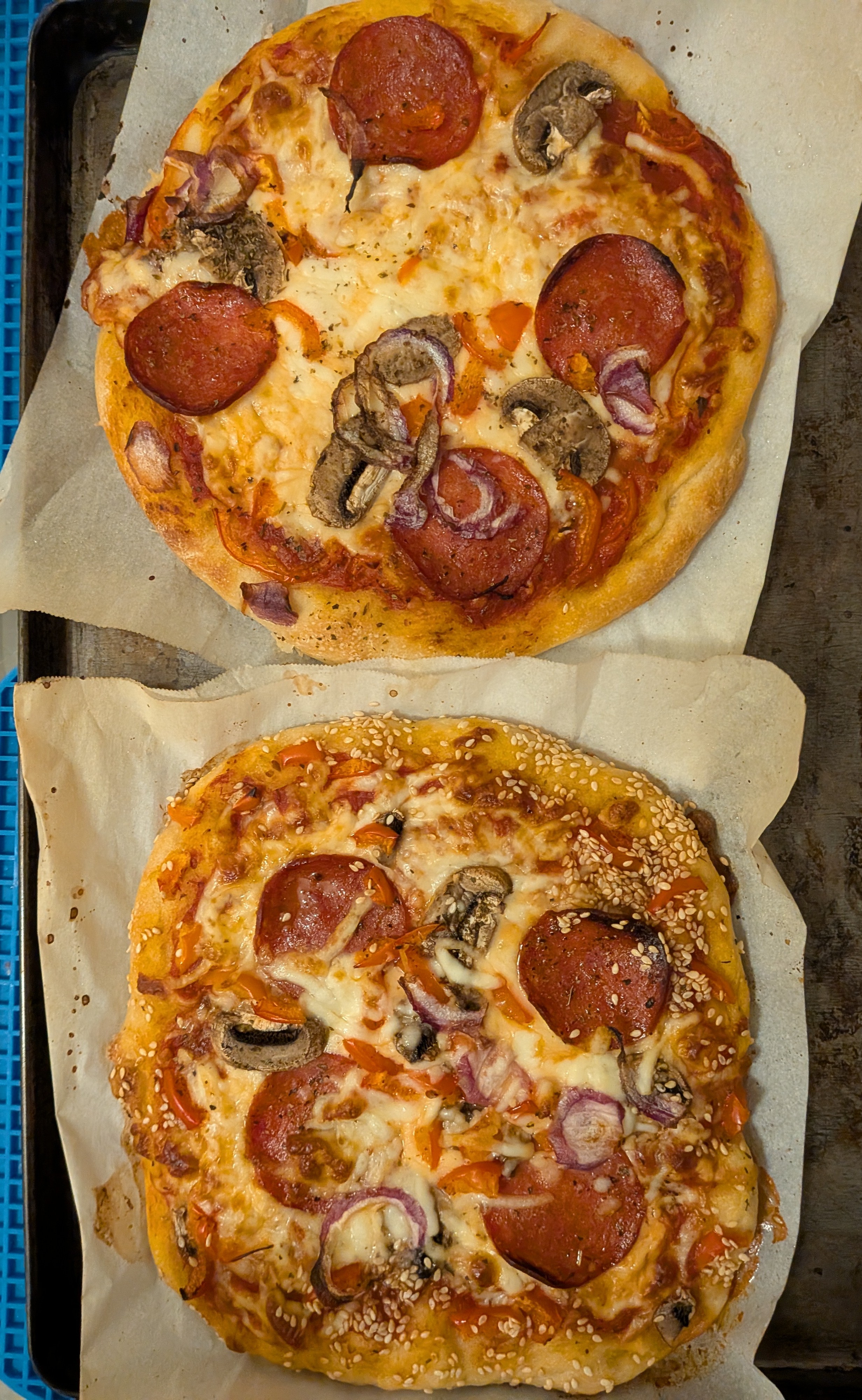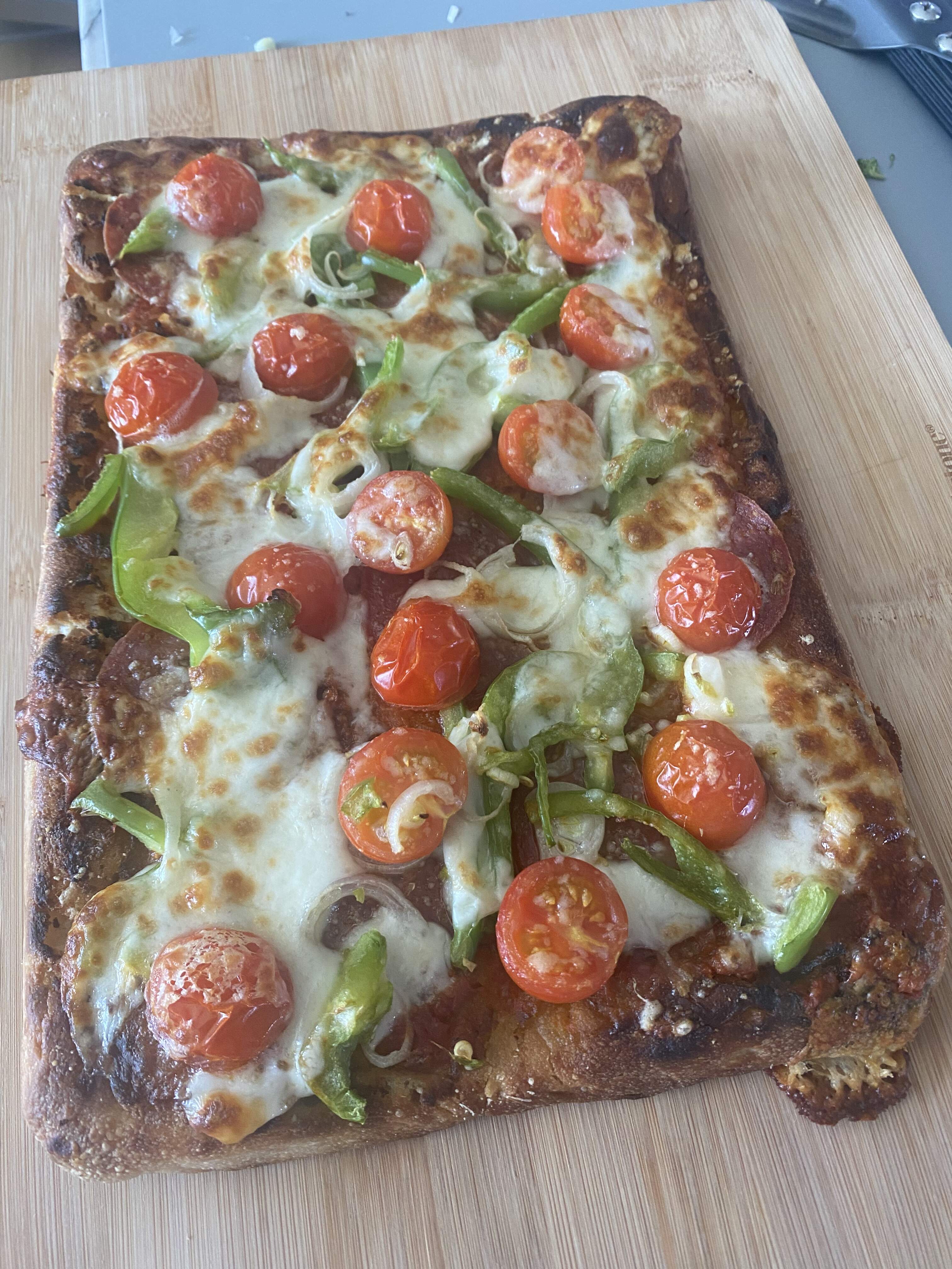 pepperoni, mushroom and red pepper. Quick crust, 2 cups bread flour, 1 cup water, 1 tsp yeast, 1/2 tsp salt, 1 tbsp olive oil, mixed with a Danish whisk. I let the dough rise 4 hours while I ran errands. Baked at 460⁰ F on a preheated cookie sheet for 15 minutes, until the crust had an internal temp of 210⁰ F.