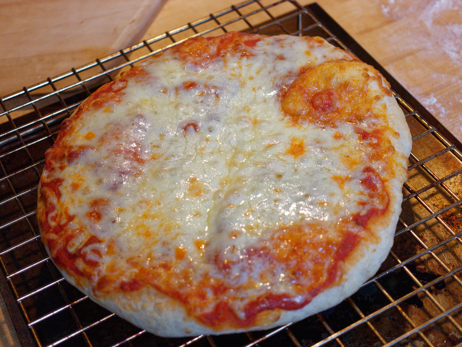 Bottom was nicely browned, but top got these huge blisters and was too thick/bready, and cheese was still too chewy.