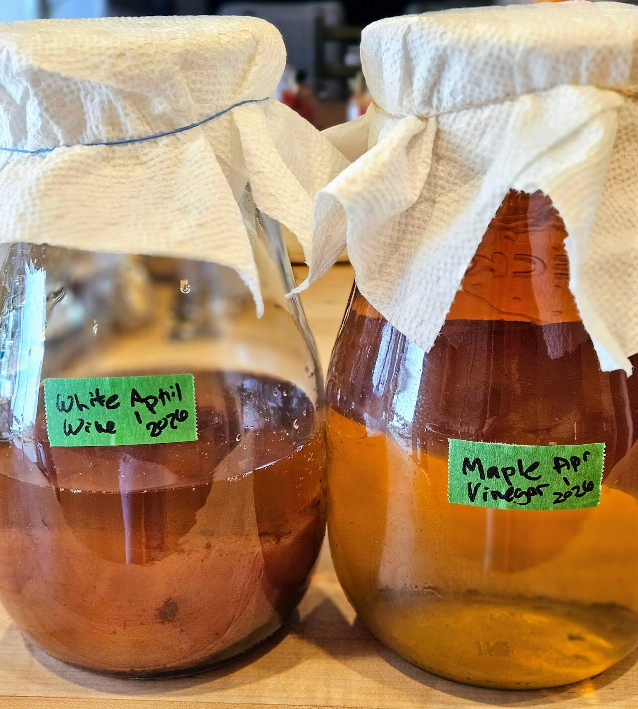 Today, I decanted my red wine vinegar and was very surprised at how large the mother had. become, so I decided to start some fresh batches. The old vinegar was made of whatever wine was left over but the new batches are going to be specific: red, white, and maple. We have a lot of maple sap from tapping the trees, so this is the perfect time to try something new. We’ll see how it turns out. I added a bit of maple syrup and a couple of shots of dark rum to the mix for interest. I’ll update in few weeks.