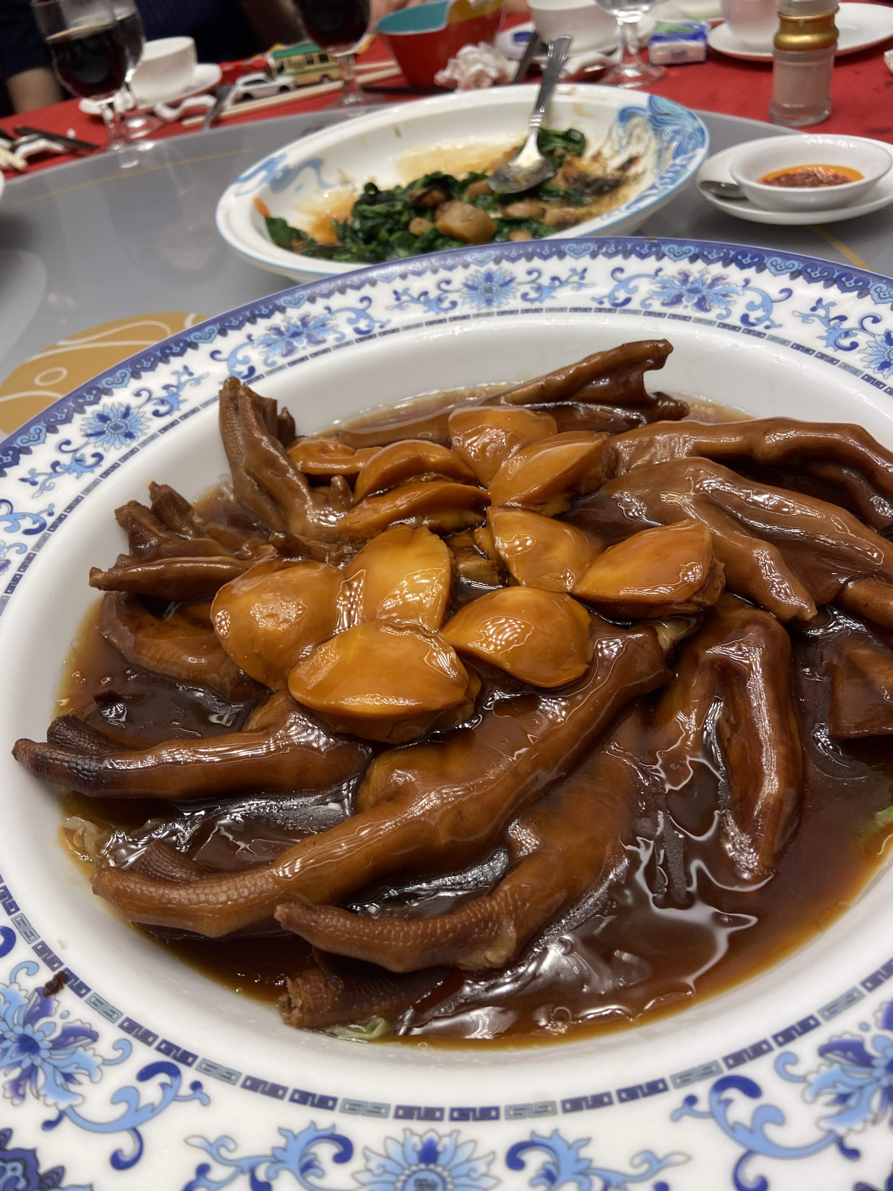 The menu for tonight’s well prepared, lavish and extravagant Cantonese dinner consists of the usual, traditional exotic and sumptuous ingredients and dishes!..whole Roasted Suckling Piglet, Stir fried jumbo Razor Clams and Tiger Prawns (omitted to take photos! Sorry!), Stuffed whole Crab Claws, Bird’s nest with freshly shucked crab meat soup, Braised whole sun dried Diver Scallops (Conpoy), Shitake mushroom and Peashoots, Braised Sun dried Abalone and Goose Web in supreme oyster sauce, steamed whole tropical Ocean Tiger Grouper, Hand held oil poached Crispy Free Range Chicken…..etc