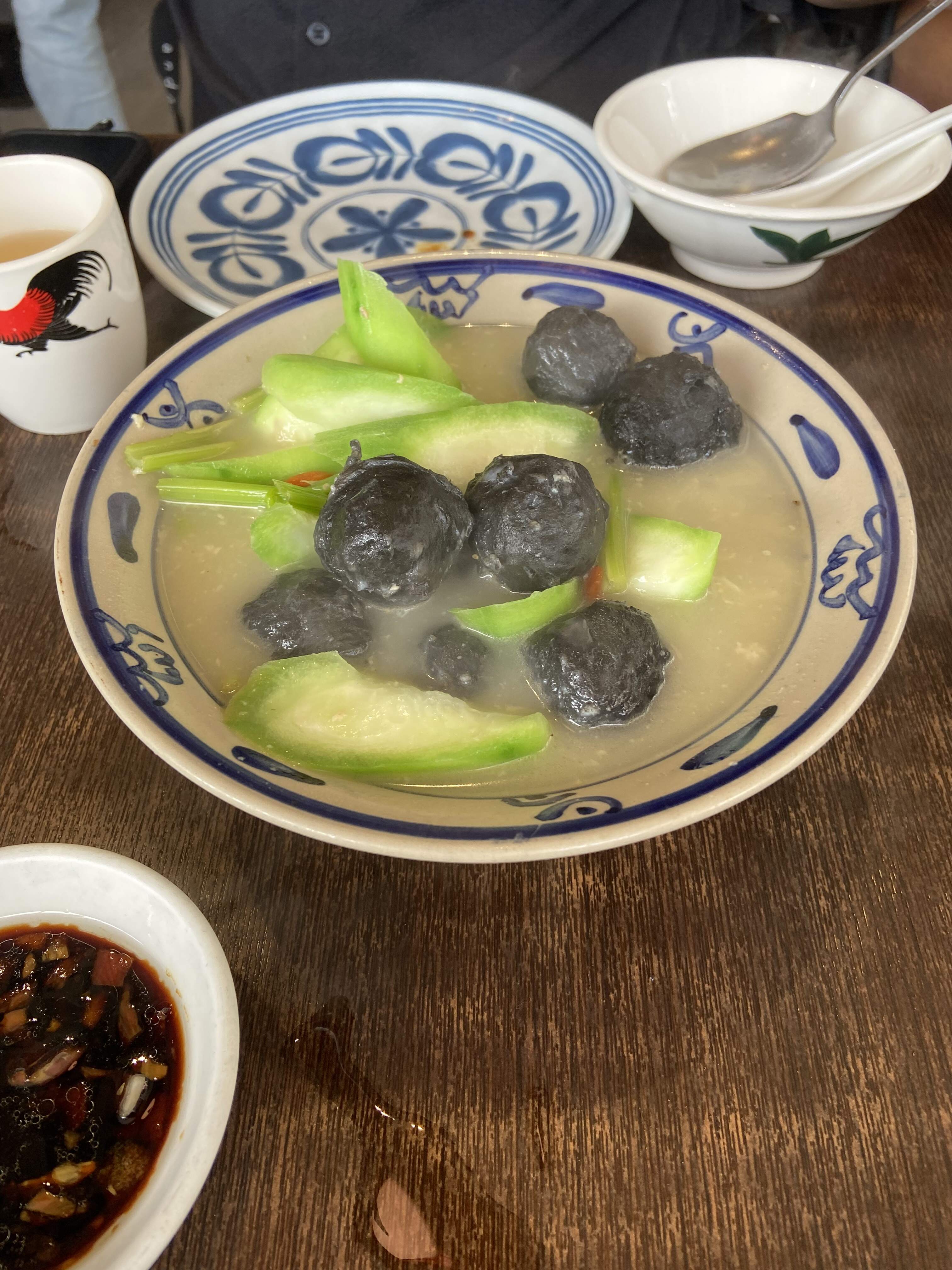Being a novice to this cuisine, we therefore let Peech and his wife take the lead in ordering. The result to myself and my wife was an impressive array of delectable, uncommon and never before tried dishes. Braised pork front-leg tendons, Stewed hand made cuttlefish balls with squid ink in Gourd melon and Shan-Tong broth, Stir fried crispy ocean Smelt with chili peppers, Braised Hakka style beef brisket and tendon in clear broth, Black caramel sponge cake and lastly, a most memorable, packed full of smokey aromatic wok-hay and addictive tasting last minute addition, ‘ Stir fried Chives with local sun dried shrimps’. So simple yet so goood!