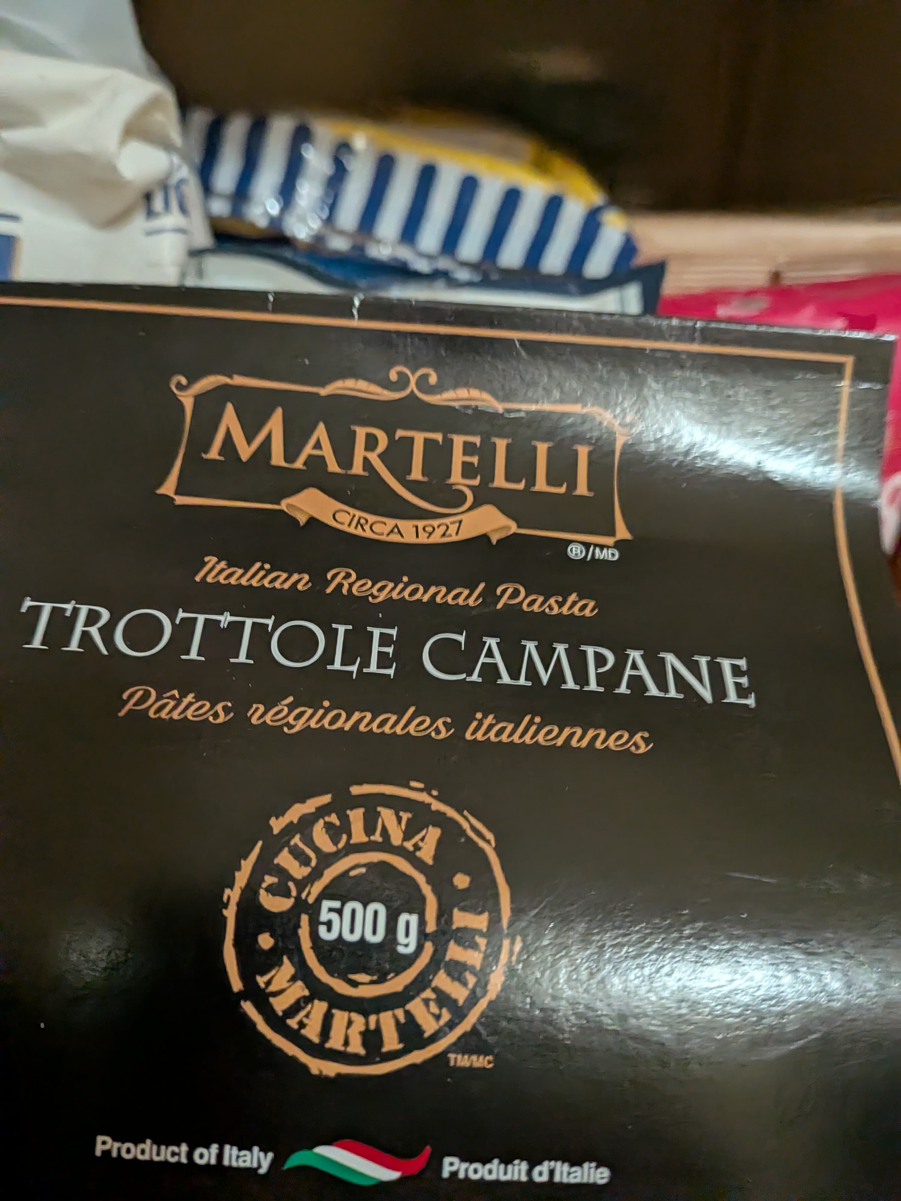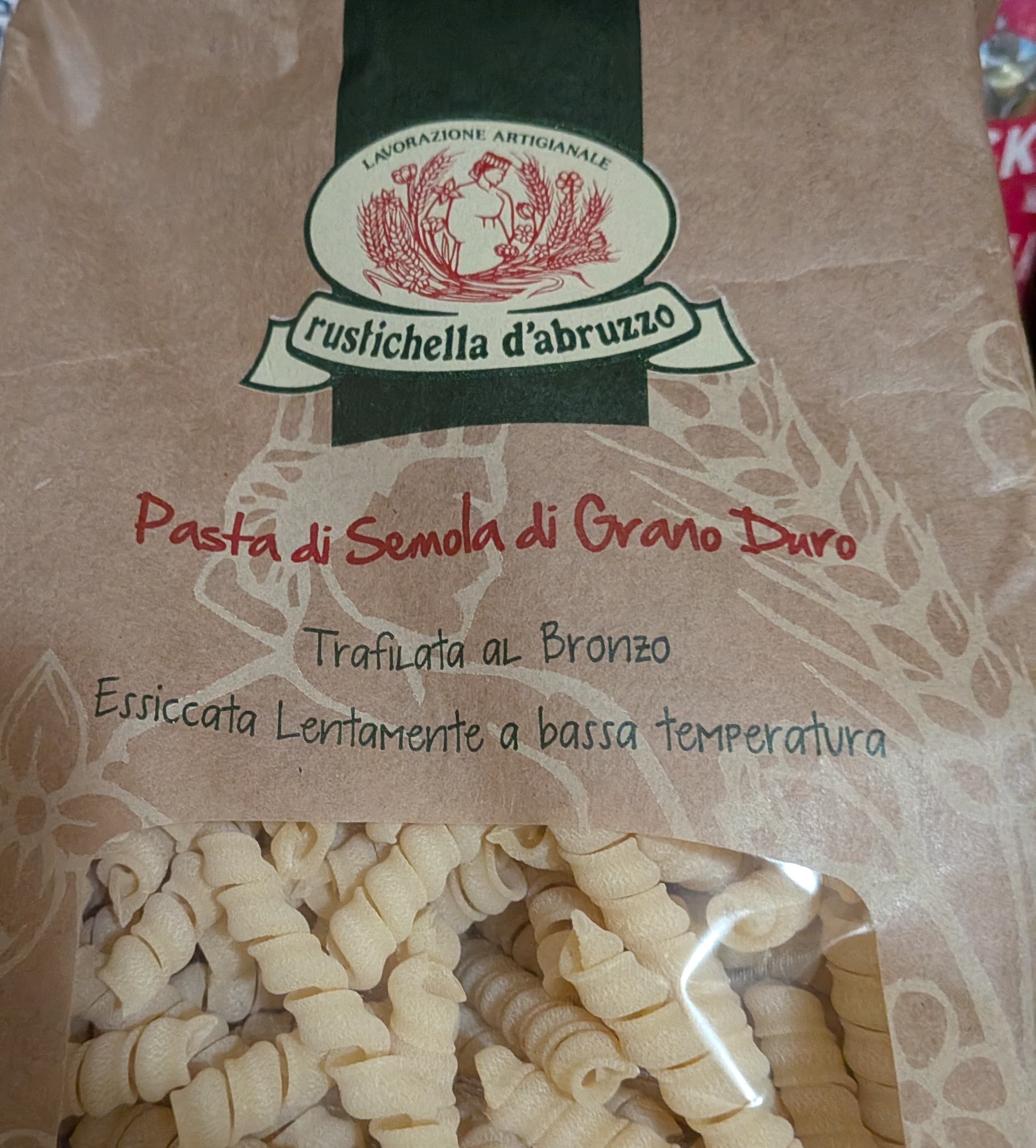 Pipe pasta jumped into my cart from the special-sale on organic pasta shelf at the store Sunday. New to me, but it’s shaped a bit like giant elbow macaroni and package says good in a baked pasta dish. A package of gnocchi tagged along, for a repeat of last June’s gnocchi with Italian sausage, tomatoes and spinach.