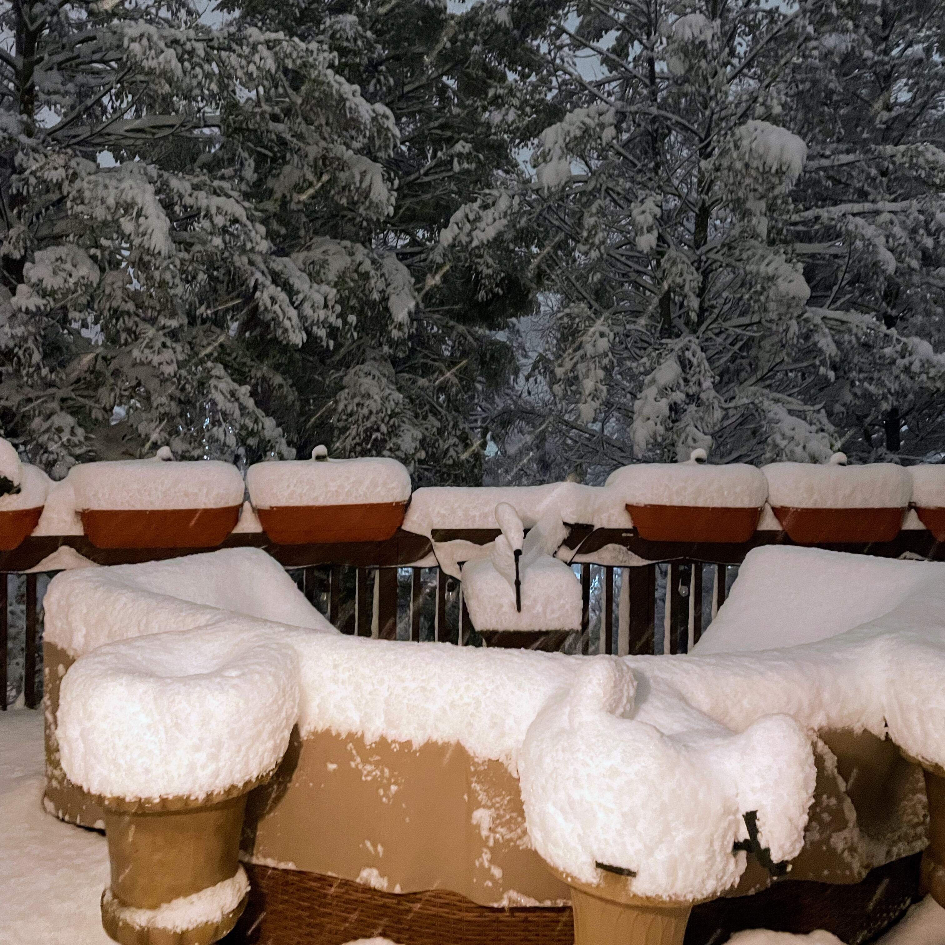 It’s very hard to tell how much snow we’ve already had. The wind has been crazy so there has been a lot of blowing around. In some places we only have a few inches and in others there are large drifts. The predictions call for 4 - 8 more inches but who knows, It’s already above 35 degrees.