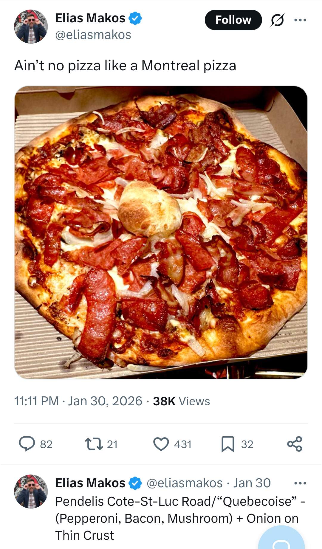That MTL style pizza I posted about above is another Greek Canadian take on pizza. (Pendelis is usually a Greek first name, could also be a last name)