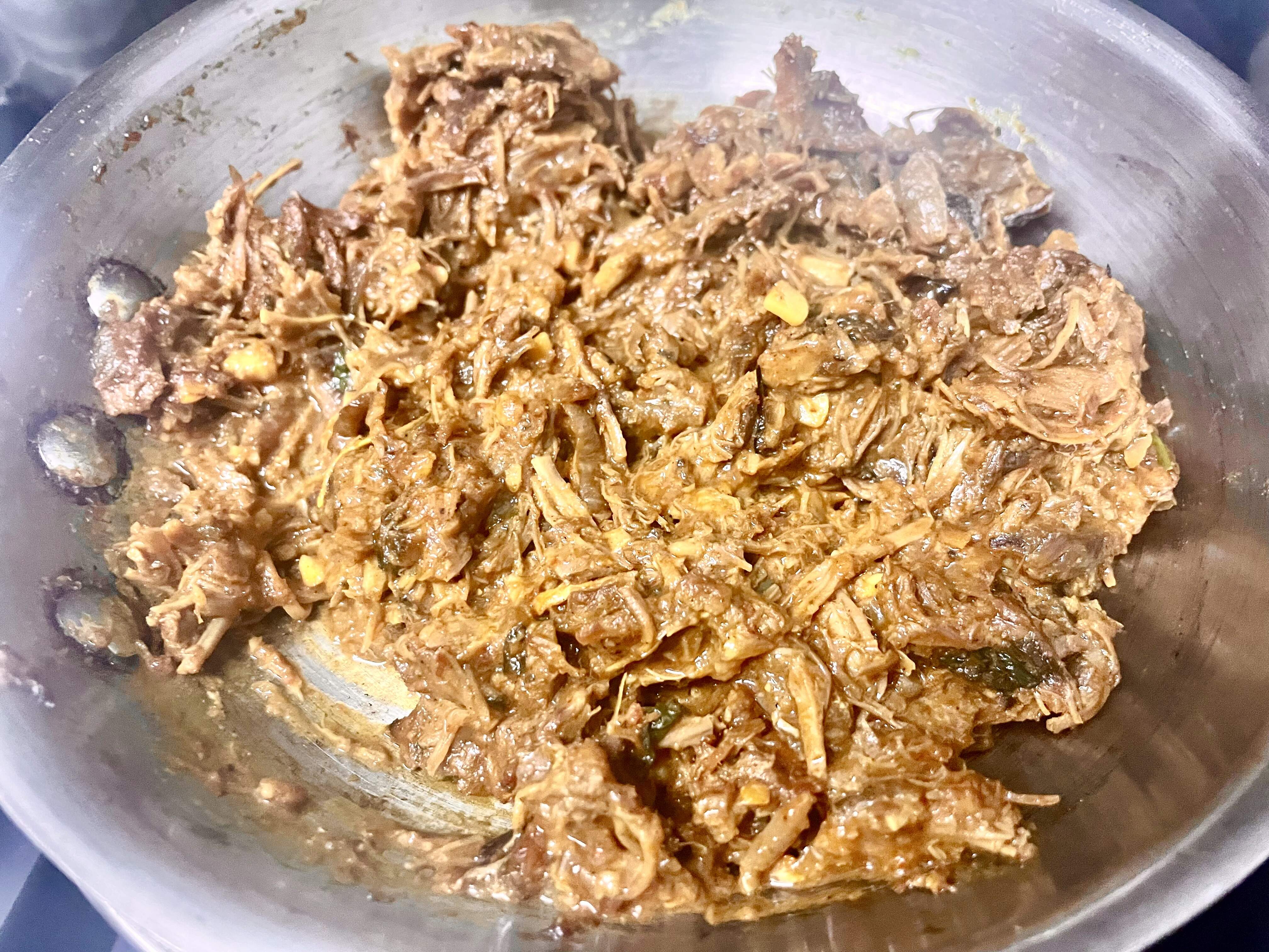 Mutton Jhalfrezie: leftover meat re-cooked with sauteed onions and garlic, some leftover gravy, and spices. (Originated in Bengal as a repurposing of leftovers with aromatics and spices, and one of my Dad’s favorite things to make from leftiver kid / baby goat roast, but I forgot the potatoes in his version.)