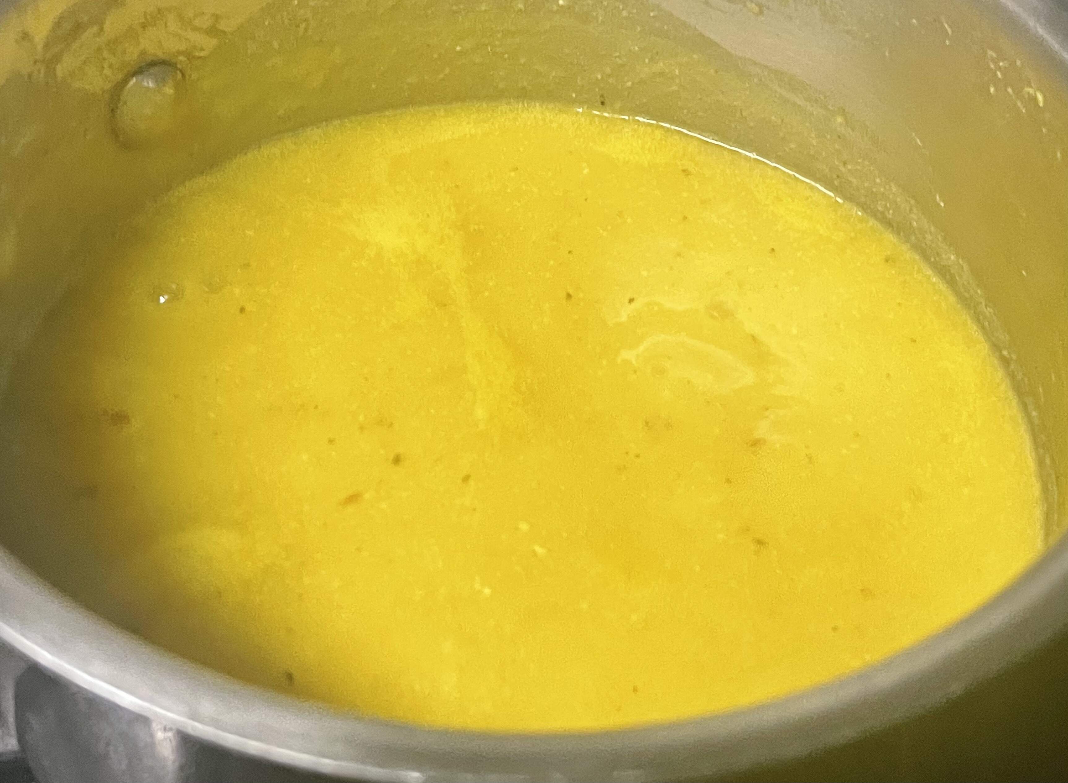 Masoor Dal (red lentils) cooked with vegetables: cauliflower stem and zucchini, plus ginger, garlic, and onion. Simple tempering of cumin seeds and garlic. I forgot the green chilli. (Many regions cook vegetable stubs with dal, though mine is inspired by a friend’s Bihari dal.)