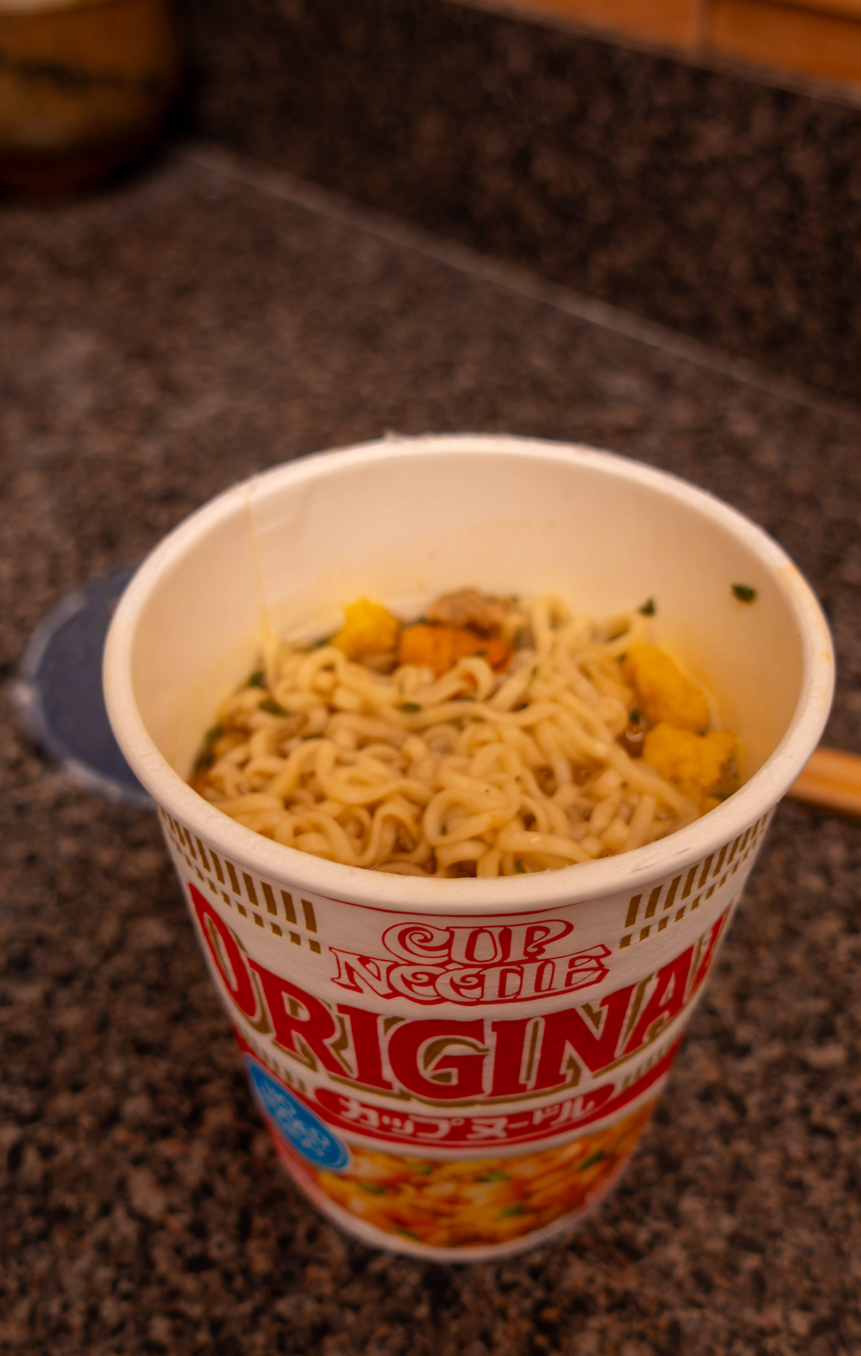 I had a Nissin Cup Noodle Original, shrimp flavor as a late night snack recently. This is the Japanese version (Cup Noodle without an S). There was dehydrated shrimp, meat bits, and egg. I got it from a Japanese market. It was a nice snack. The noodles were a little too soft but I maybe just let it steep too long.