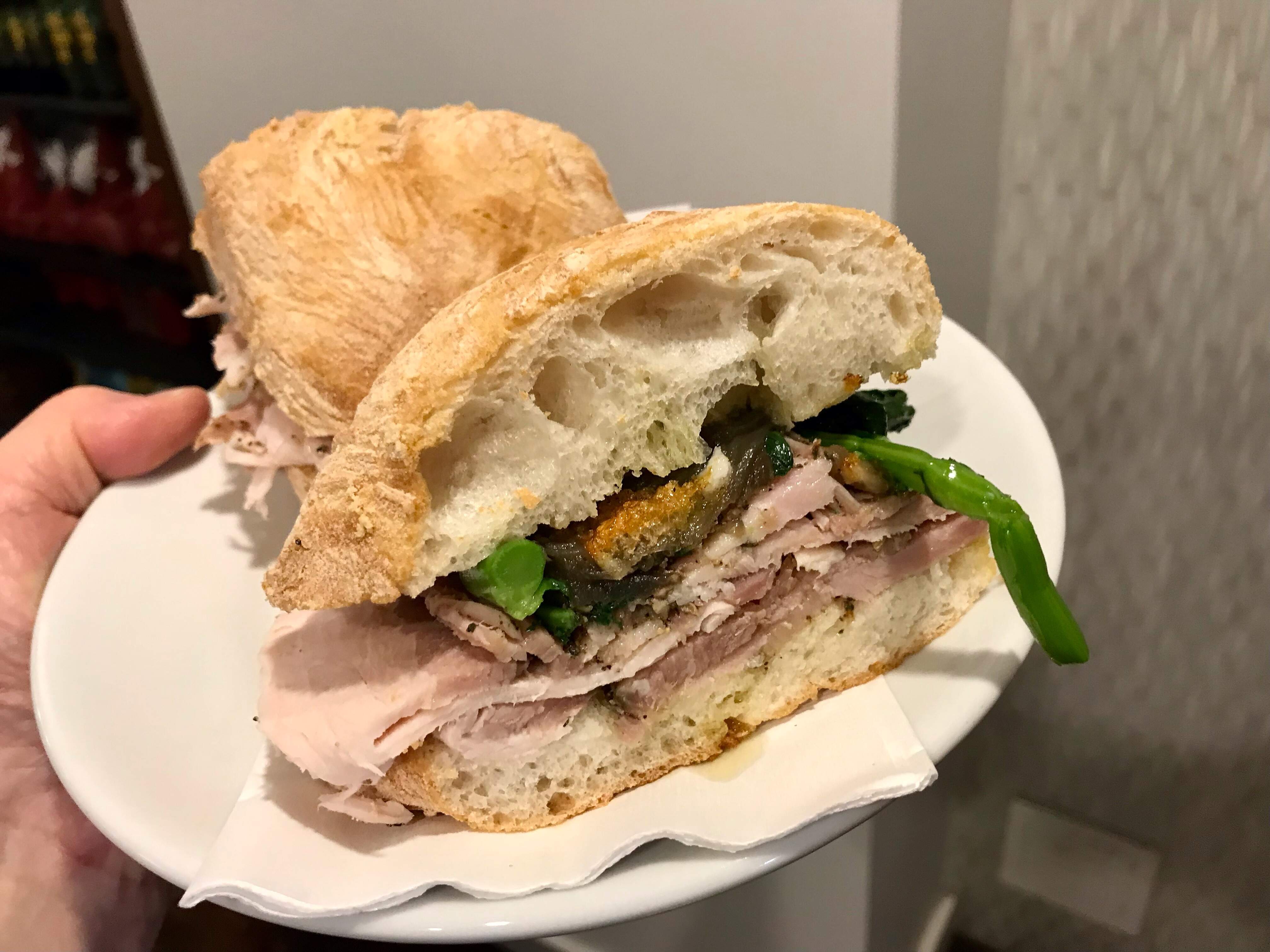 Recently stopped in at the Queen St. location of Sud Forno, searching for their mortadella panettone. It was a Saturday, so they had a porchetta sandwich station, which we couldn’t resist. The pork itself was juicy, nicely herbed, with delicious crispy skin. It was loaded into a crusty ciabatta bun with caramalized onions, cooked rapini, and a dash of olive oil. Mmm mmm good. We also rounded out our order with their yummy mortadella sandwhich on a focaccia festooned with olives and red peppers.