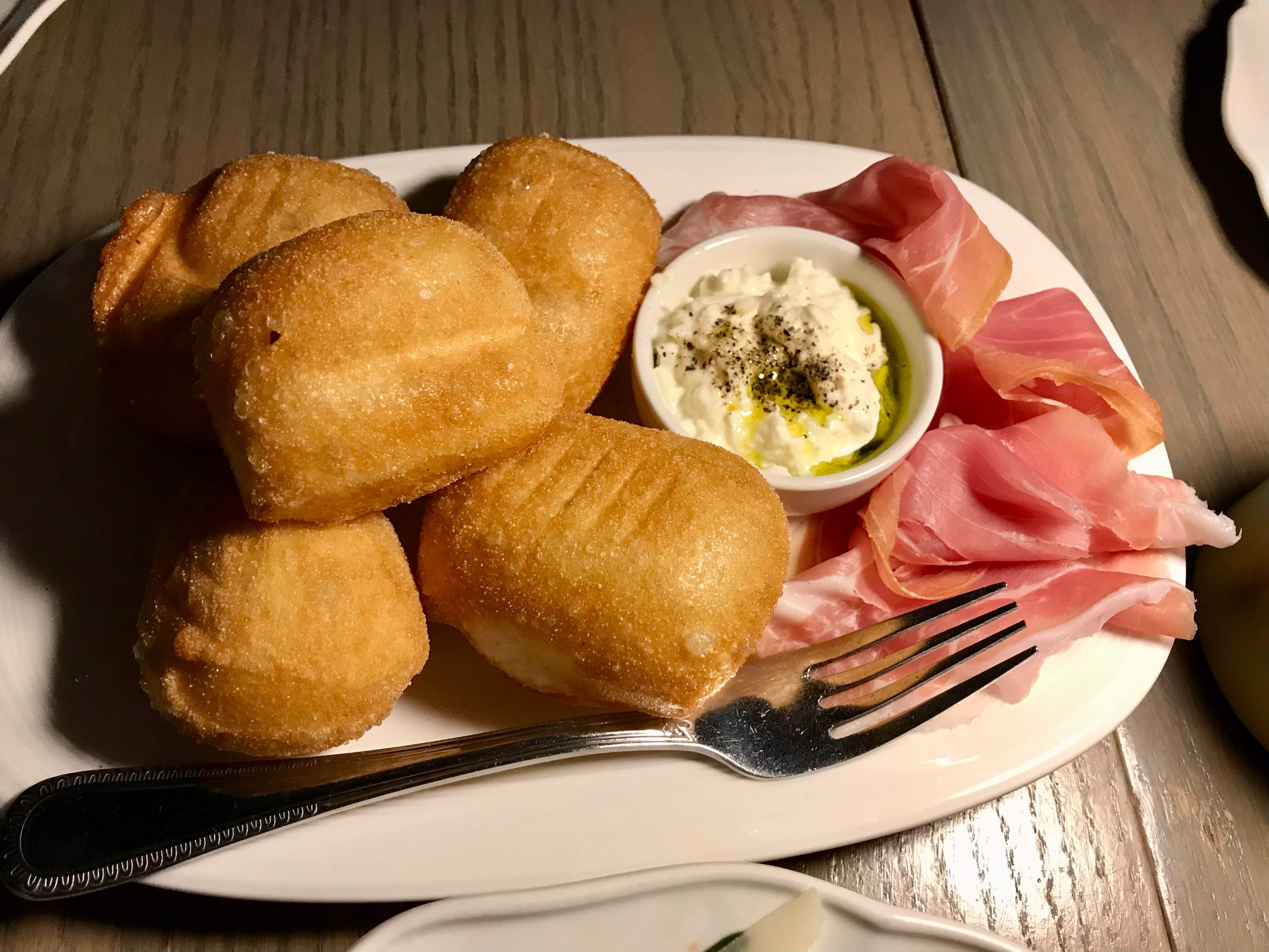 Coccoli featured fried pizza dough balls, served with prosciutto di Parma, creamy stracciatella, basil oil. More great dough, with tasty accompaniments.