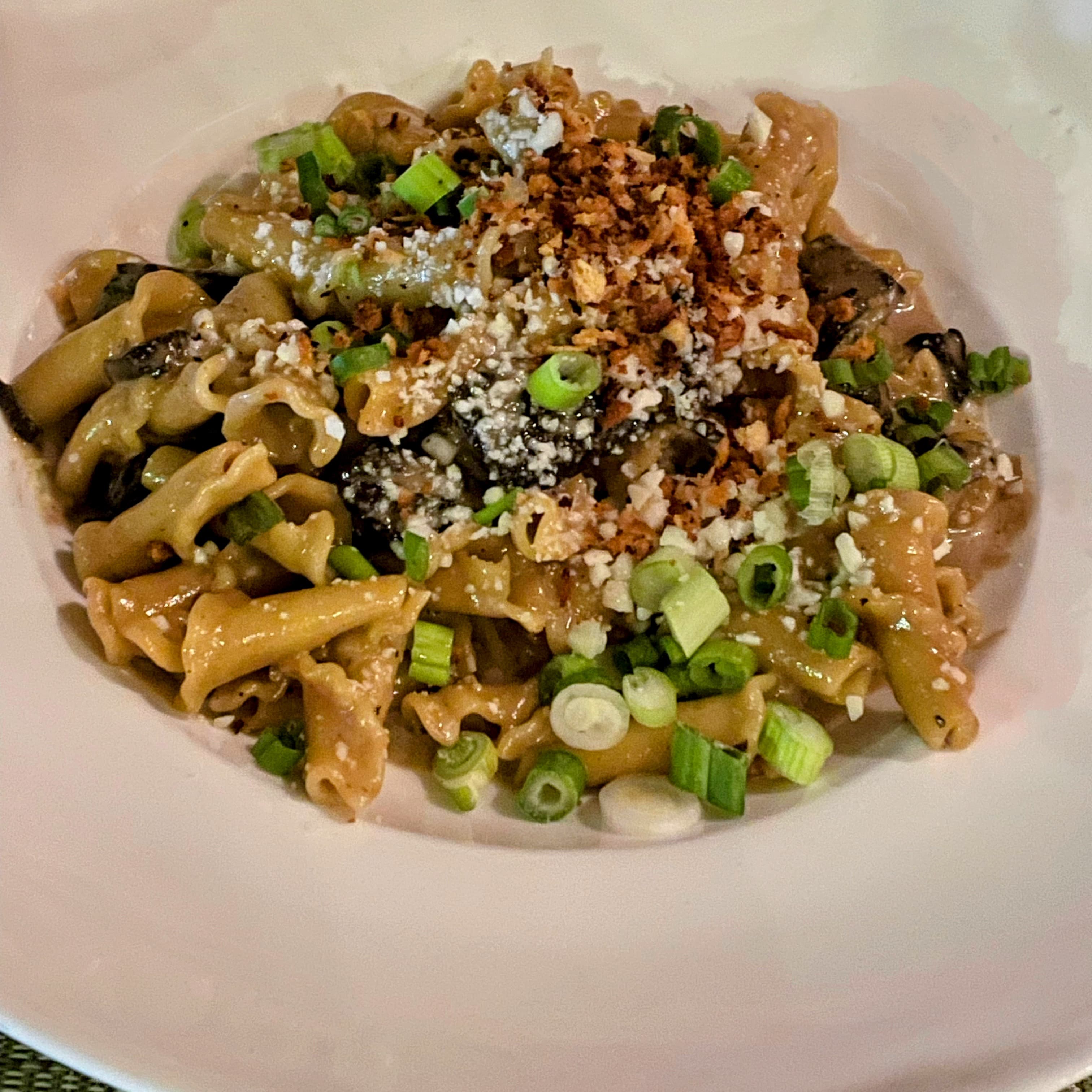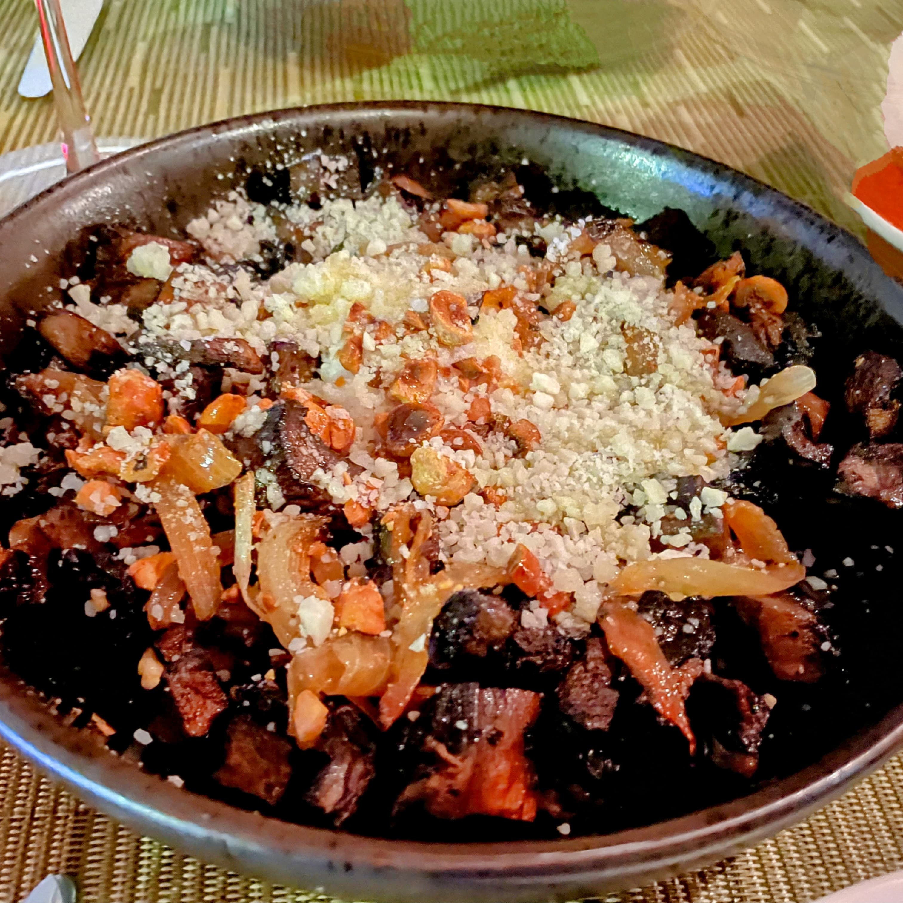 We enjoyed an excellent spicy sausage pizza with fresh mozzarella, onion, and hot chili peppers; a fantastic gigli pasta with mushrooms, pecorino cheese, black truffle, and scallions; excellent fire roasted meatballs with creamy ricotta and garlic; roasted mushrooms with pecorino, hazelnut, truffle, and egg yolk. It all went great with an excellent cabernet and red blend.