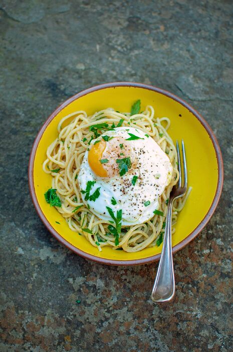 This is pasta dressed with almost-Caesar salad dressing, with a fried egg on top if you like that.