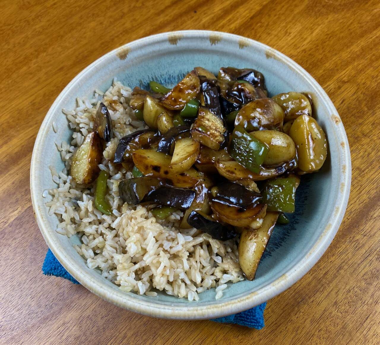 Getting a few reports in just under the wire. I’ve made a number of dishes from this book, but haven’t had time to write them up. And now it’s been a while (I made this one on August 12), so I don’t have enough memory of the process to say much about it. What I can say on this dish was that it was good, in a gentle, comforting sort of way. It is a medley of potato, eggplant, and green pepper, chosen mostly because I had eggplant and green peppers in the CSA box. The flavors are mild. I might have thrown some chile flakes in.