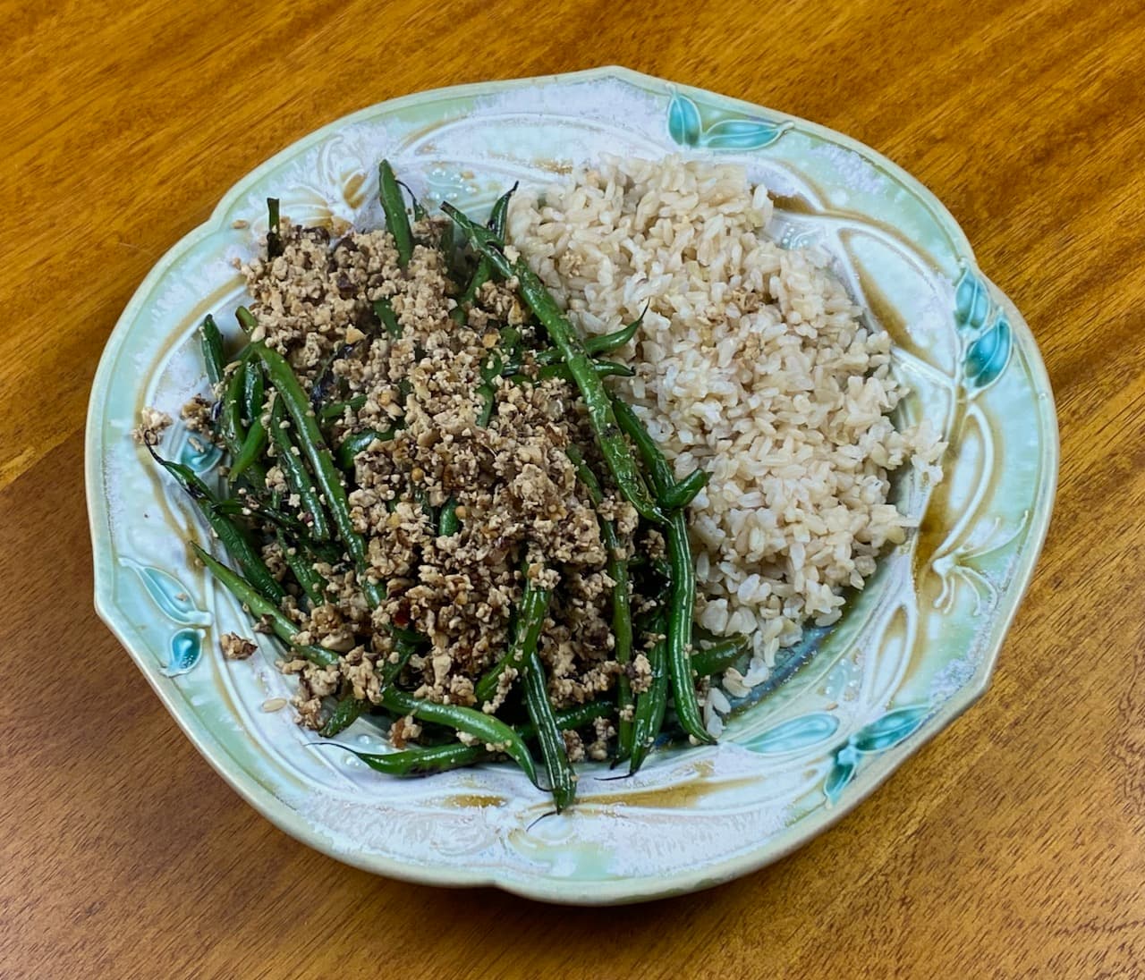 This is a version of dry-fried green beans. She has you cooking this (and all stir-fries) in a skillet rather than a wok. And cooking in stages to not overcrowd the skillet. So you start out here frying the green beans. She calls for 4 Tbs of oil here, and yet a non-stick skillet. I don’t see why you would need that much oil if using non-stick, and I used a fraction of it. Anyway, you cook the beans, then set them aside and cook the mince, which is a mix of tofu and shiitake mushrooms that have been blitzed in a food processor. The mince gets seasoned with fresh ginger, garlic, scallions, red chiles, and Sichuan peppercorns. I went heavy on the latter. At the end, you combine the two components of the dish, and add Shaoxing wine and soy sauce. Would I like these better cooked in a wok? Yes. Did this version work? Also yes. It was fine. I’d make it again if beans came in the CSA box and I was sick of fasolakia.
