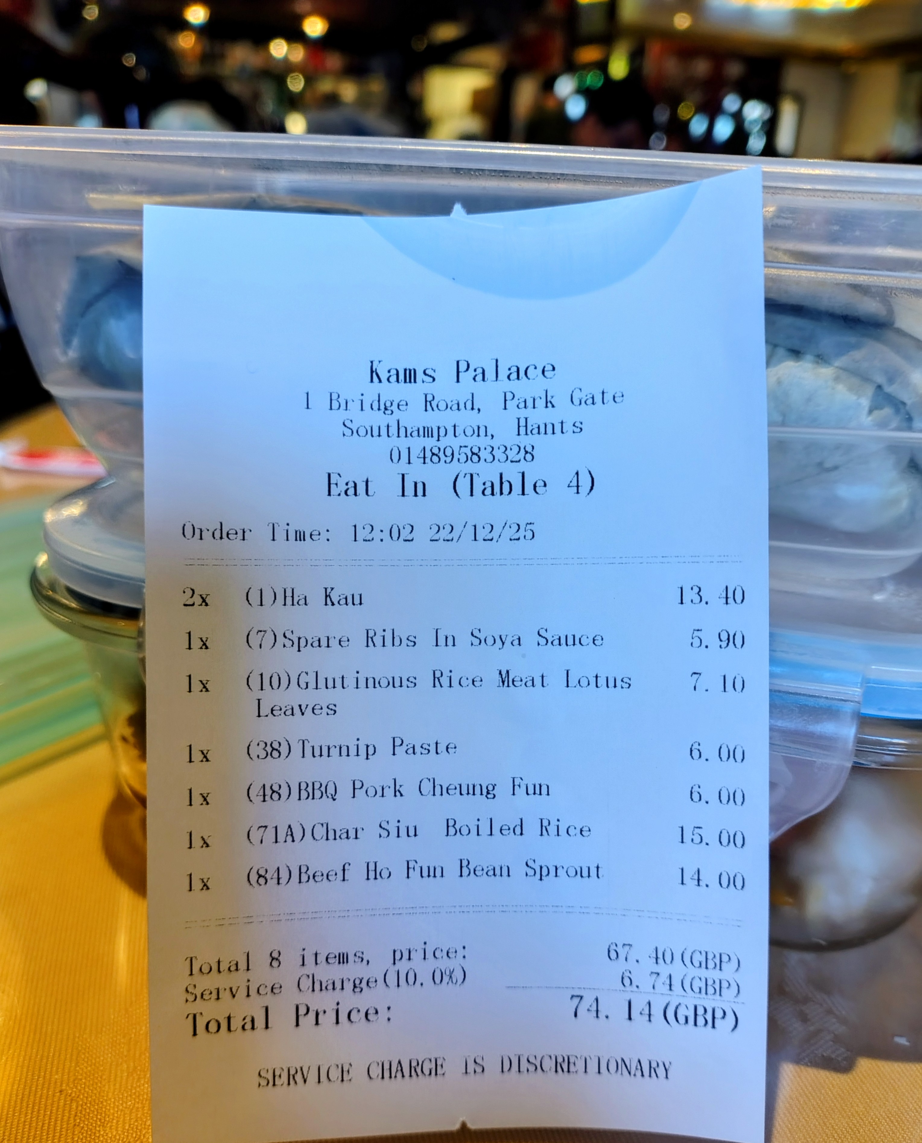 It’s a testament to Kams that I didn’t take any further photos apart from one of the receipt - I was too busy stuffing my face. Turnip paste is done really well here. Char siu and rice was a nice mix of lean and fatty slices. I didn’t try the har kau or steamed ribs. Glutinous rice and meat in lotus leaf has suffered from ‘shrinkflation’ but is still reliable.