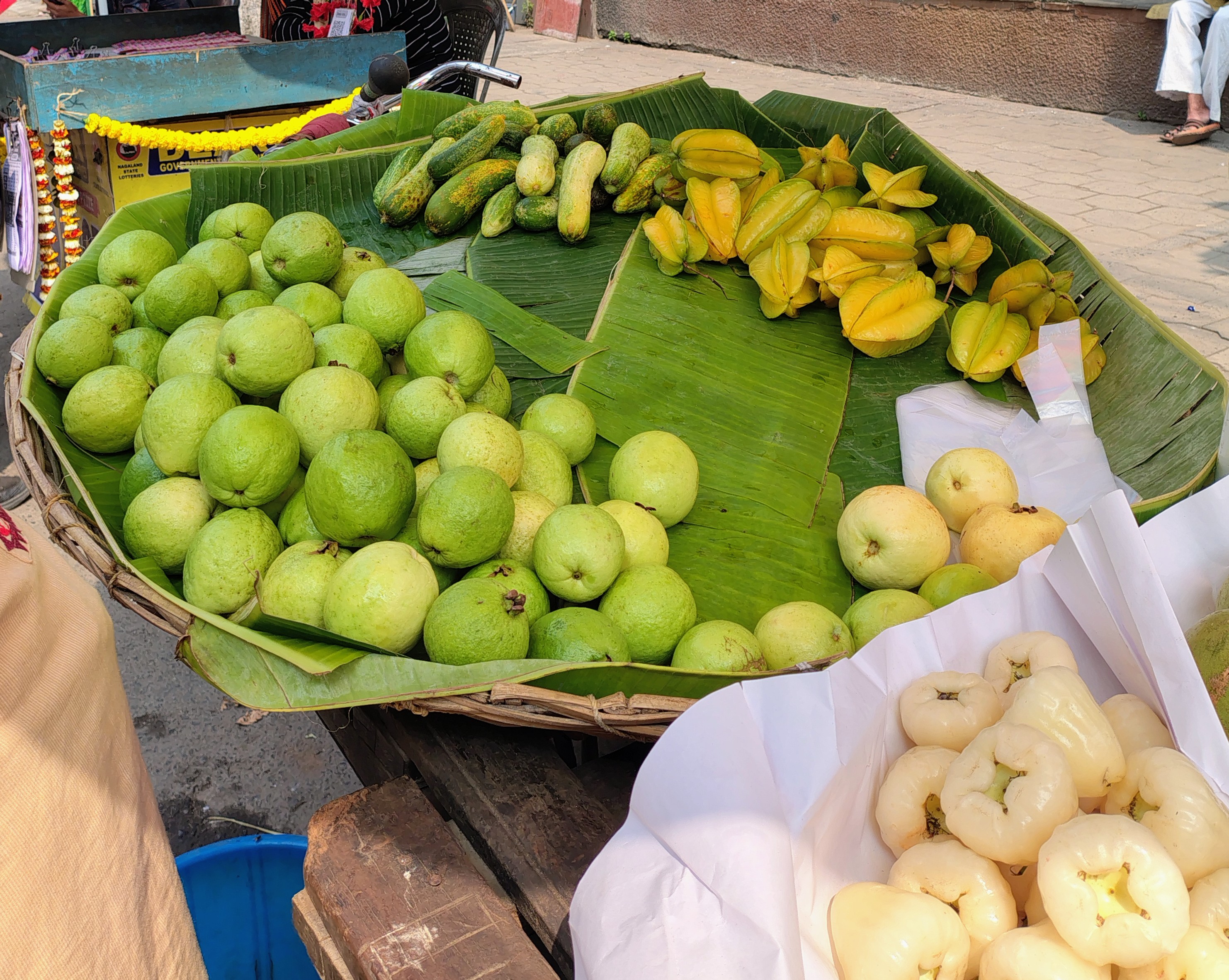 A close up of some of his wares, the few ripe guavas grouped off to the right of the basket lined with banana leaves. He has a selection of other fruit, including green grapes, star fruit, jamrul, safeda and kul (don’t know the English names for the last 3!). And some random tiny cucumbers!