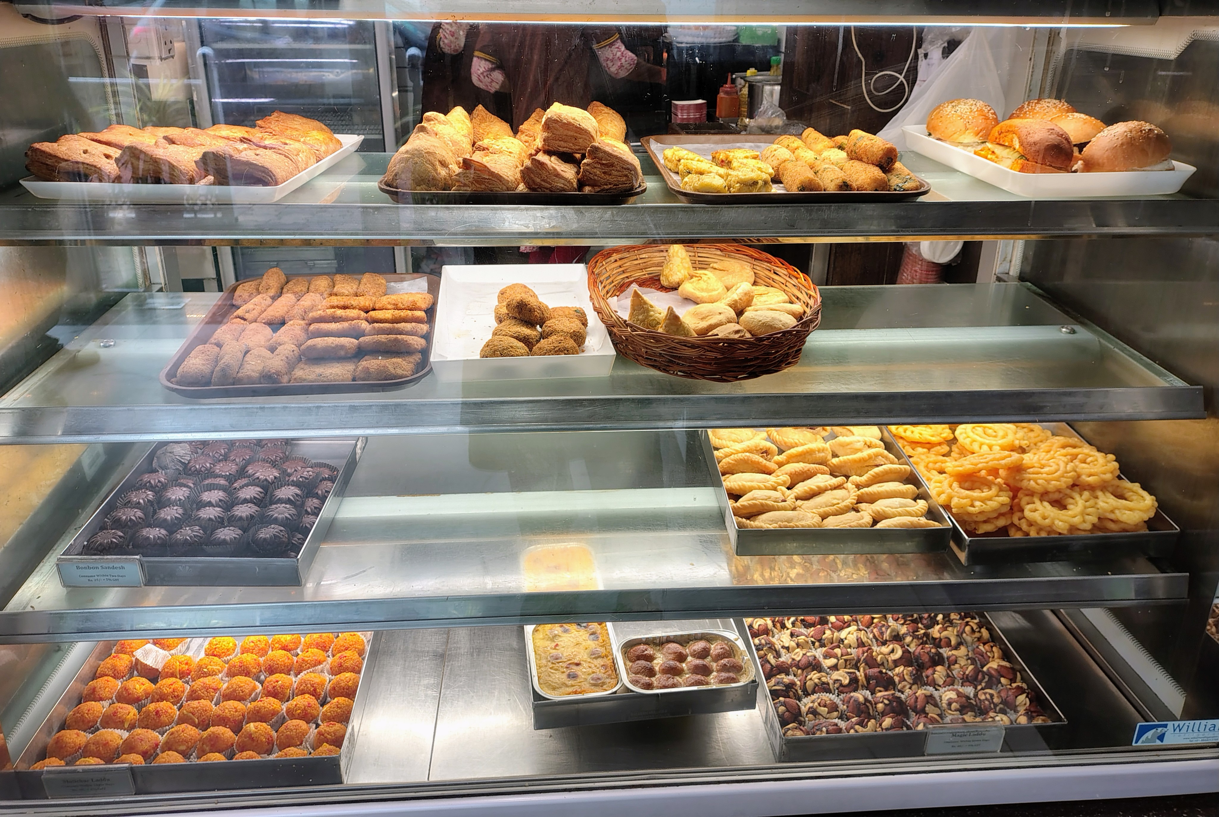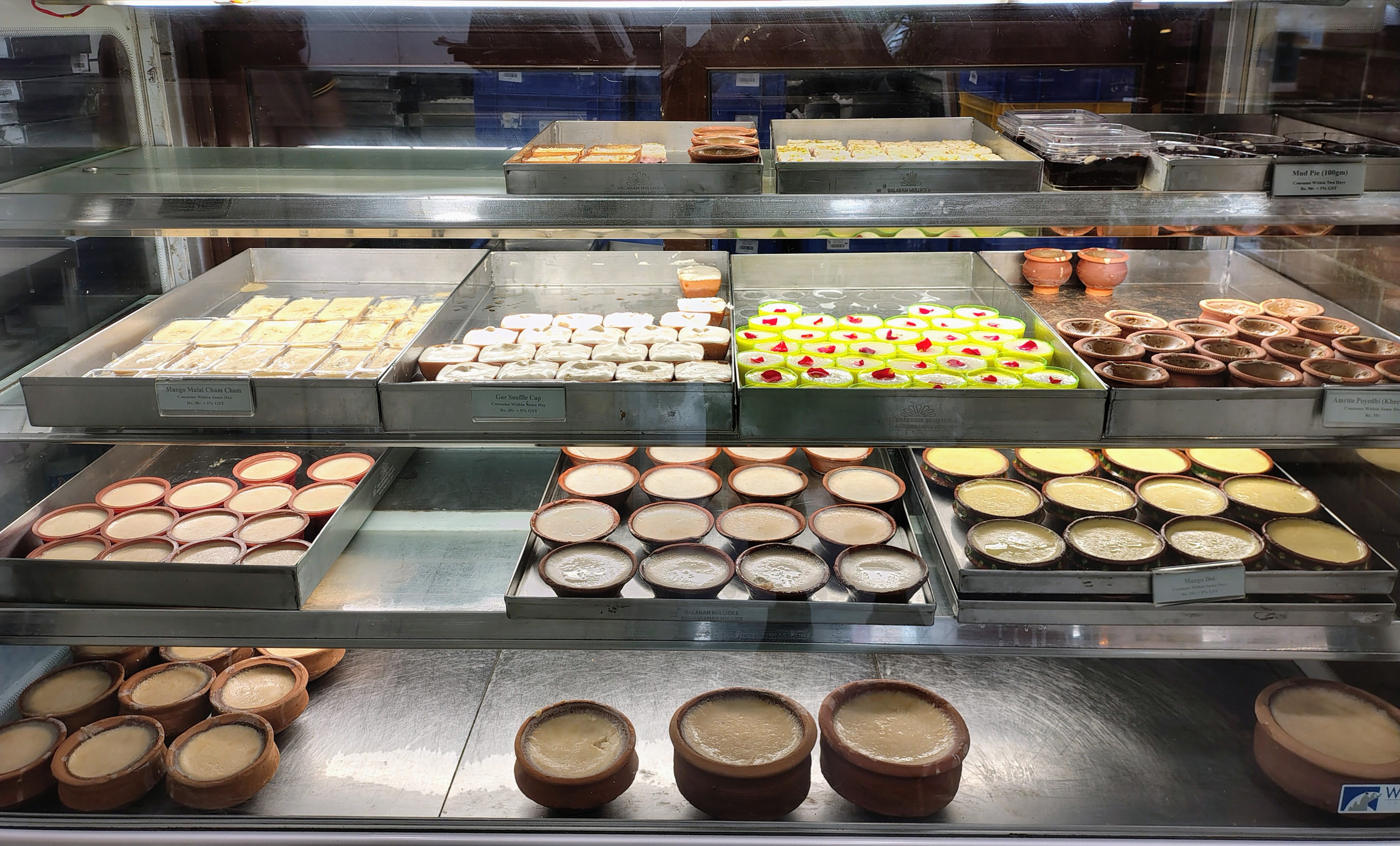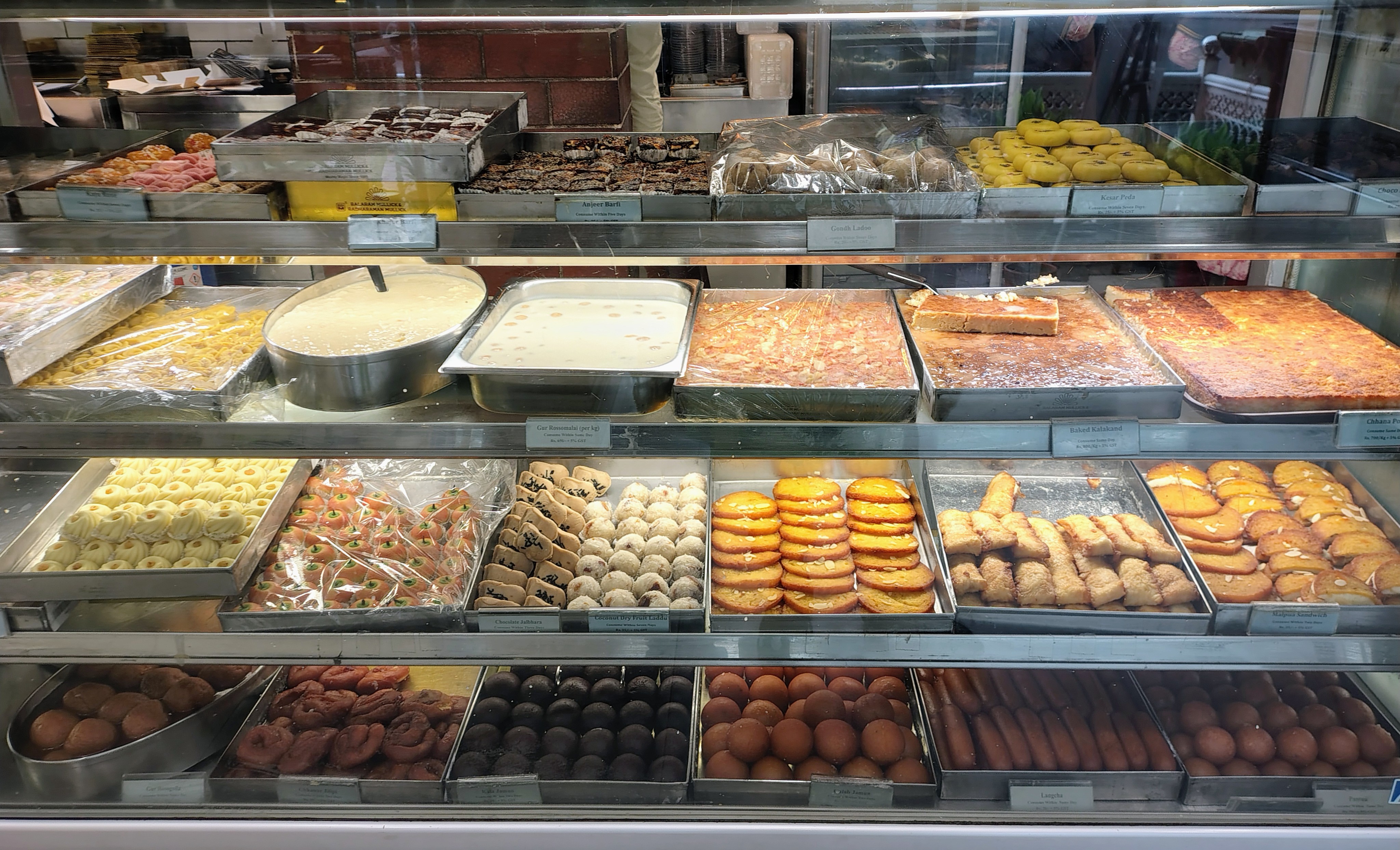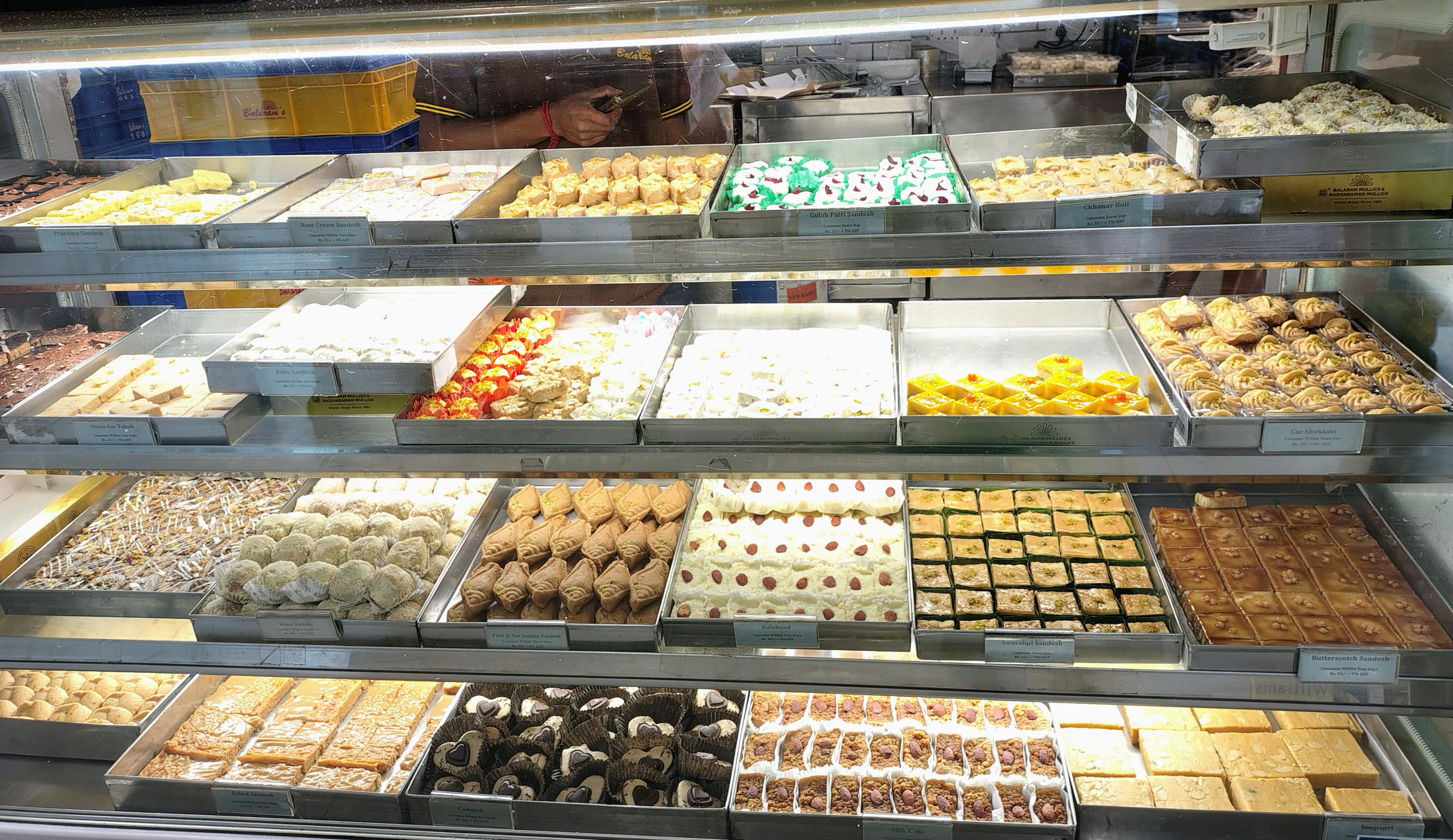Two other entire display cases of a mixture of traditional and nouvelle Bengali sweets.