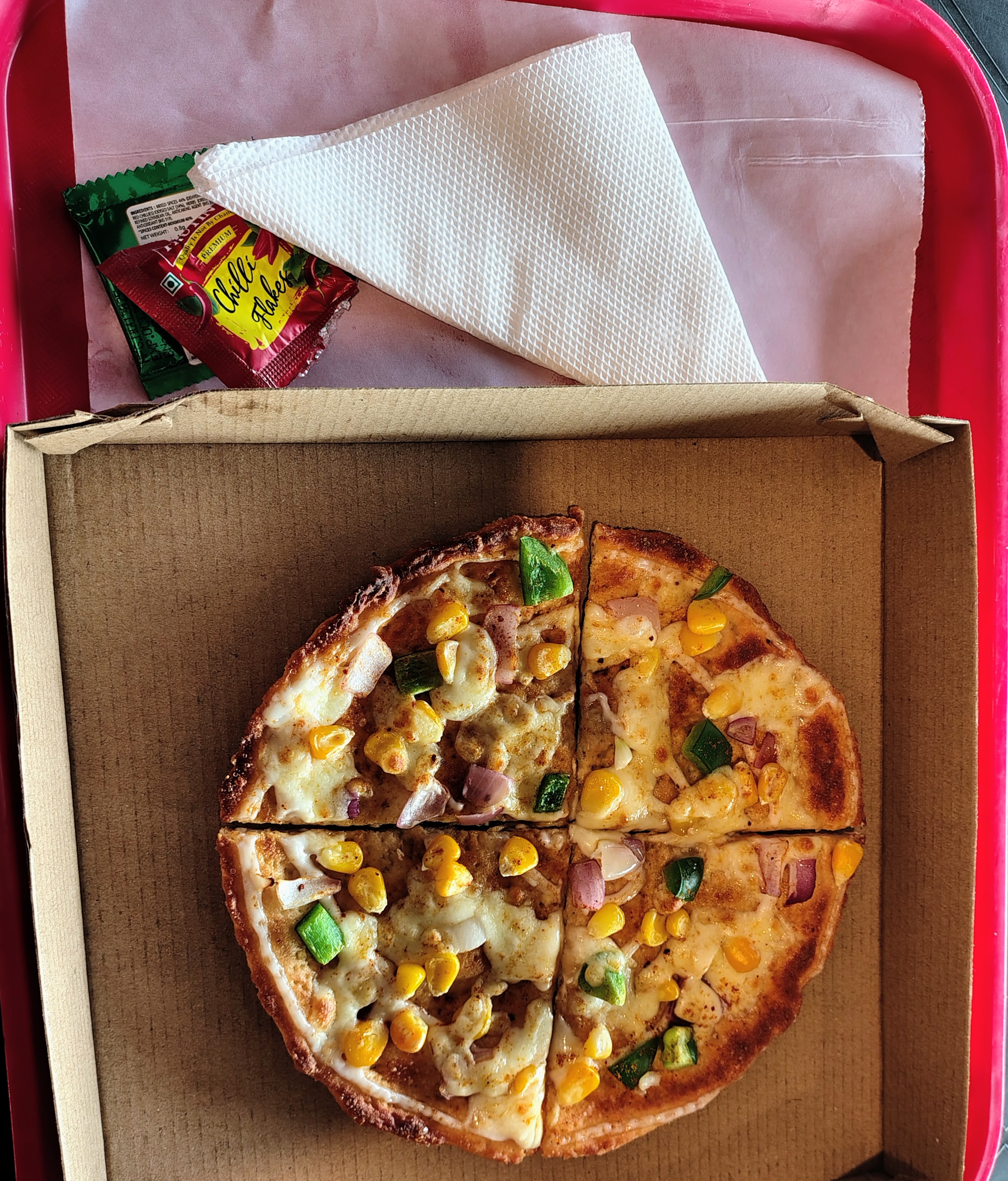 Came with small packs of chilli flakes and oregano which we didn’t use. The little pizza-like cheesy flatbread was pretty good for the price.