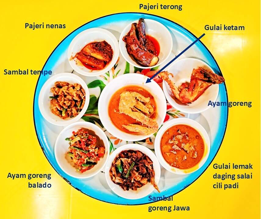 Using the pesan (order)-style, one goes to the food display counter and select oneโs dishes which will be ladled onto serving saucers by the server, and arrayed onto a large, traditional Malay dulang (flower-patterned enamel-metal serving tray).