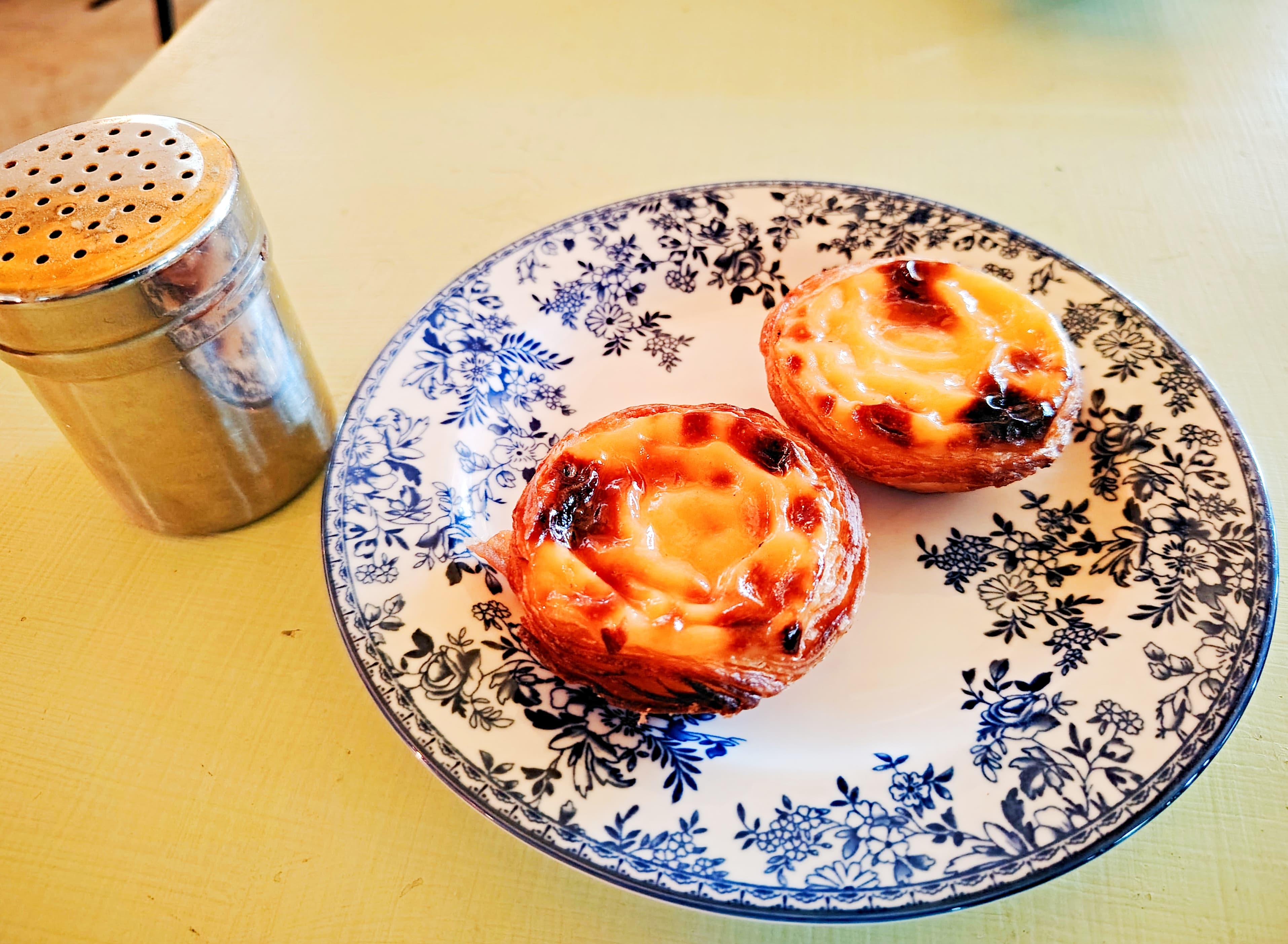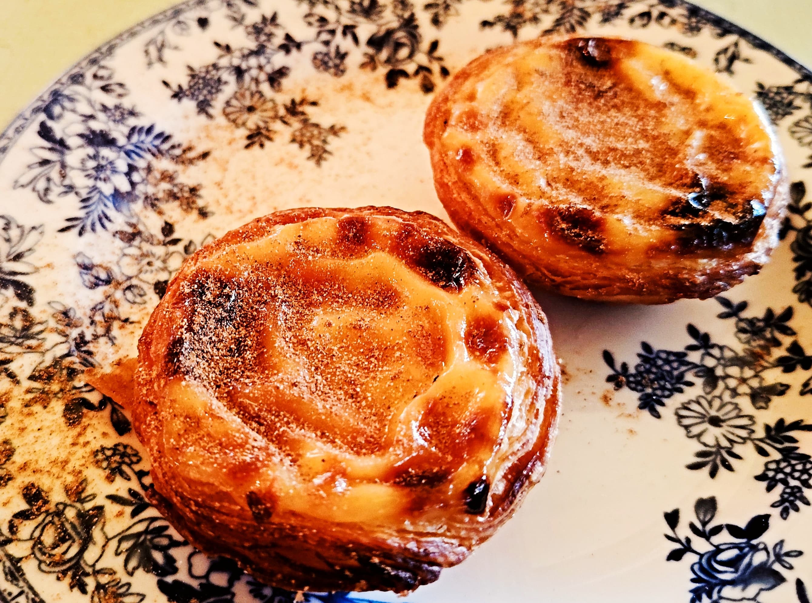 ๐๐ข๐ด๐ต๐ฆ๐ญ ๐ฅ๐ฆ ๐ฏ๐ข๐ต๐ข, also known as ๐๐ข๐ด๐ต๐ฆ๐ญ ๐ฅ๐ฆ ๐๐ฆ๐ญ๐ฆ๐ฎ - Portuguese egg tarts with their trademark mottled top, served with a sprinkling of cinnamon powder.