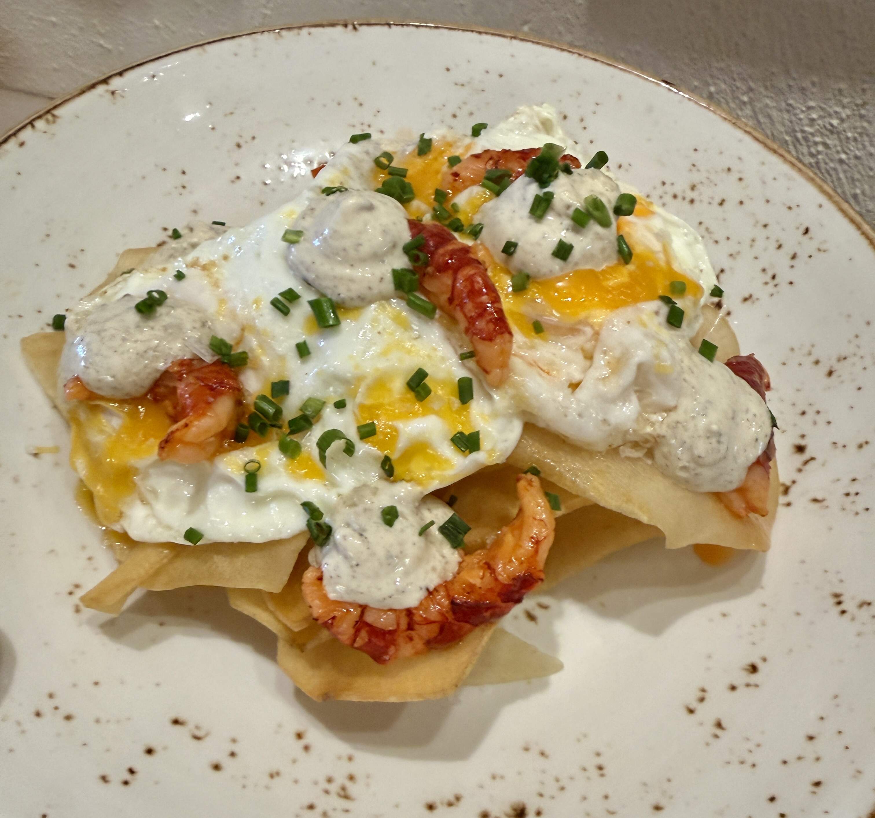 huevos rotos con camarón (their signature dish on potato chips/shrimp/ truffled mayo and obviously eggs…OK but not overwhelming)