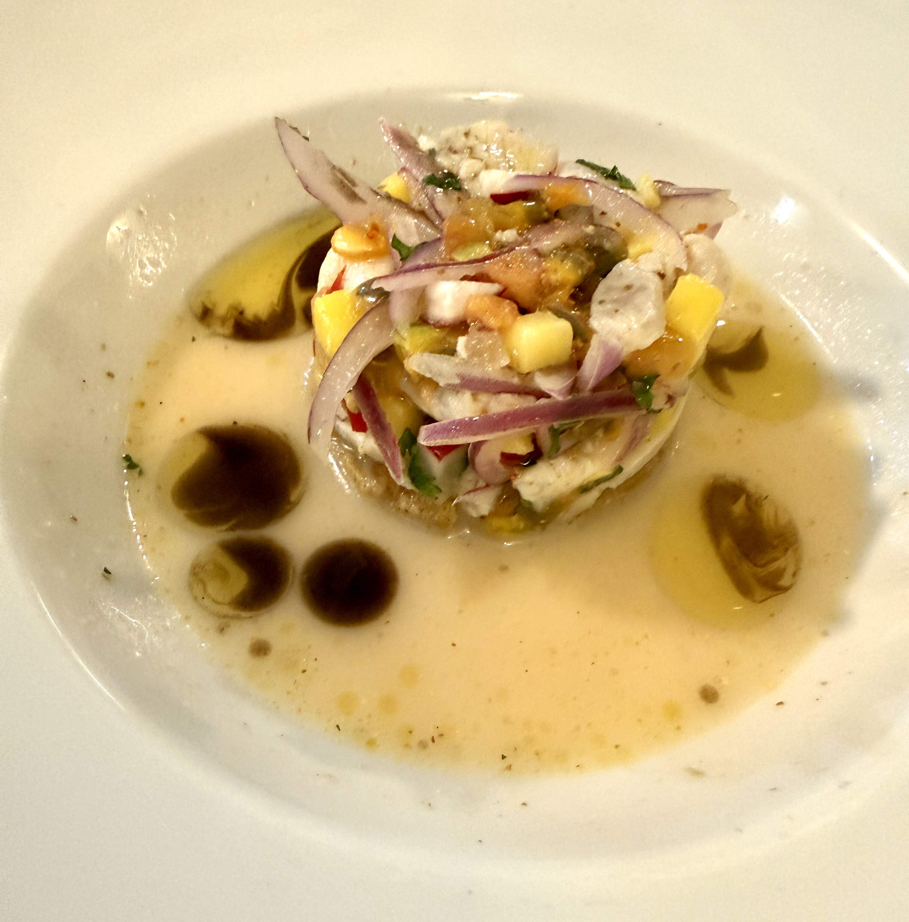 Grouper ceviche canarian style. Very different from other ceviches. Mixed with fried gofio bread. We liked it a lot.
