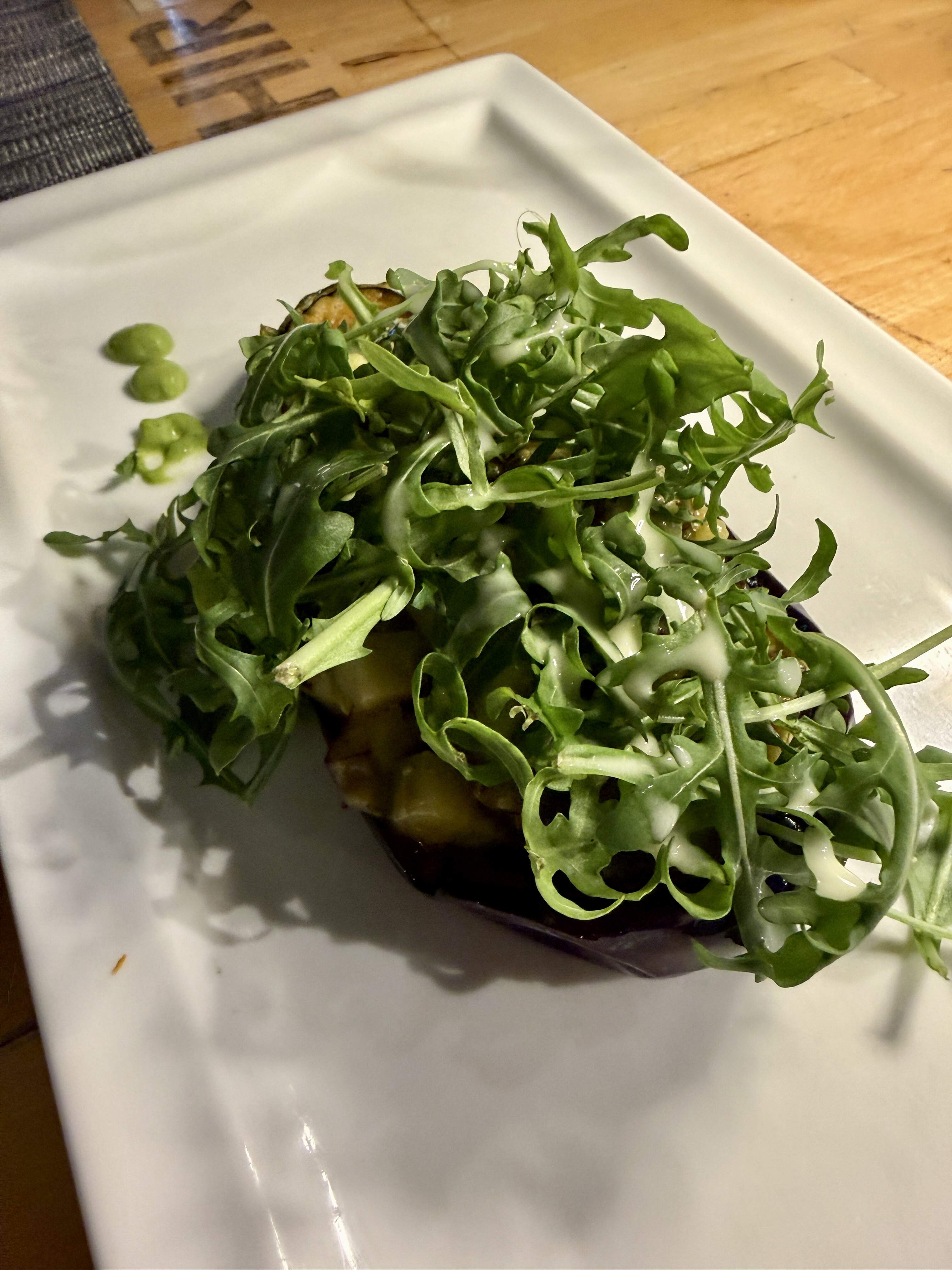 interesting deep fried eggplant with a different type of green sauce and arugula