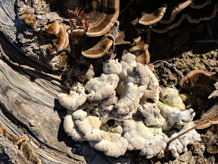 Late fall Oyster Mushrooms are more firm and flavorful than the typical white one. The clusters are very densely-packed with individual mushrooms. Plus, it’s so cold, insects are not an issue. I expect a few years production from the large logs before the fungus digests the wood into humus.