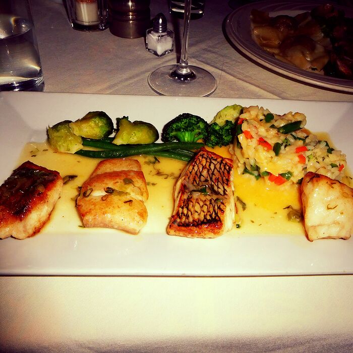 We started off with a very flavorful Lobster Bisque soup that contained huge chunks of nicely seasoned crab meat (which I later found out that the chef very generously comped us). We did share a couple of glasses of some nice French red blends with him.