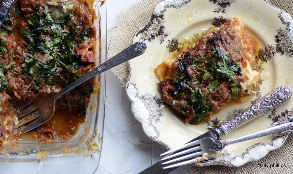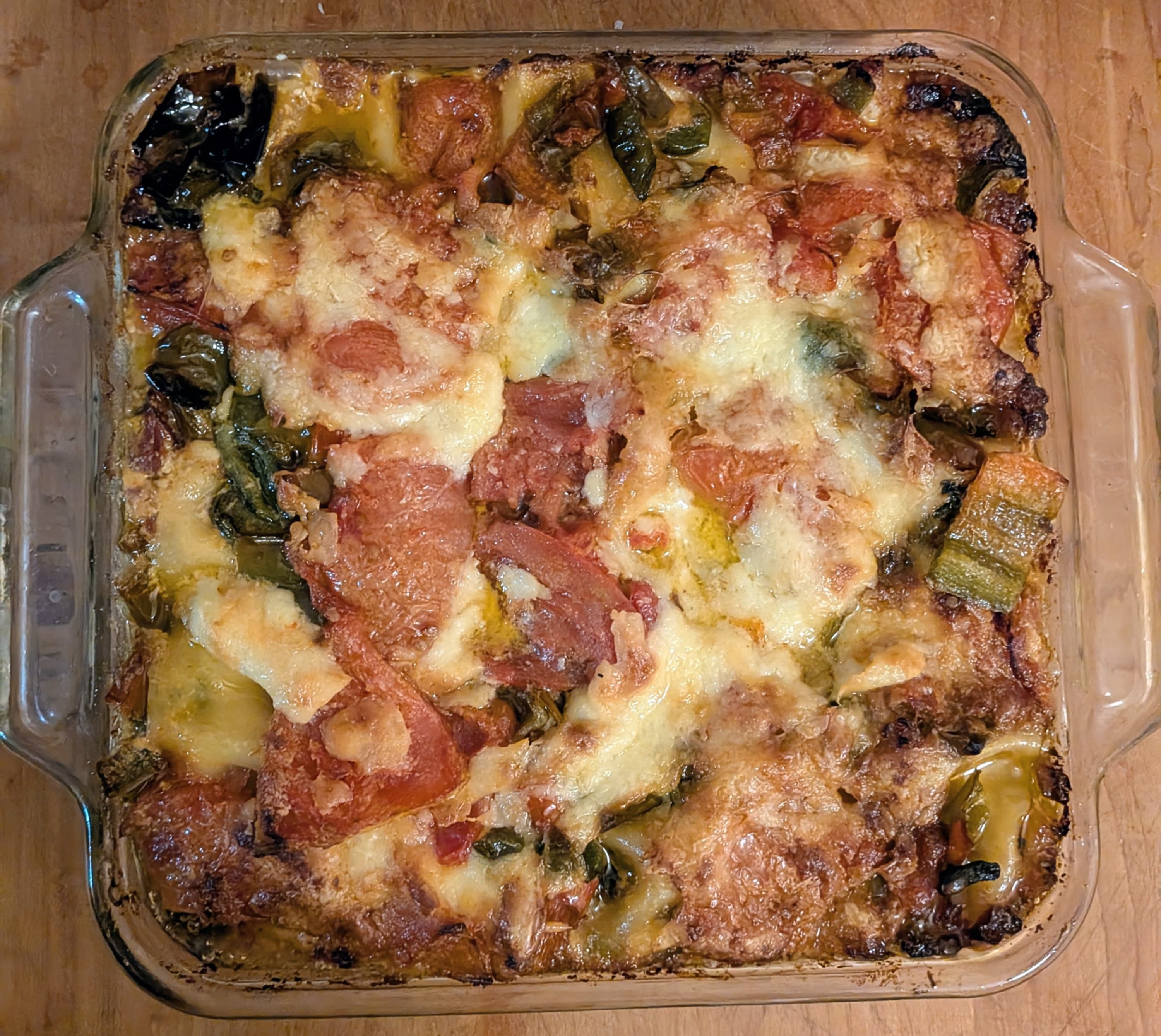 Lasagna made with prime rib, mascarpone, roasted tomatoes (last of the garden tomatoes, some frozen and some from the fridge), 3 canned cherry tomatoes leftover from something earlier this week , fried onions, fried hot peppers from the freezer , mozzarella, Havarti Gouda blend , and mushrooms. I used oven-ready egg lasagna noodles from Farm Boy.