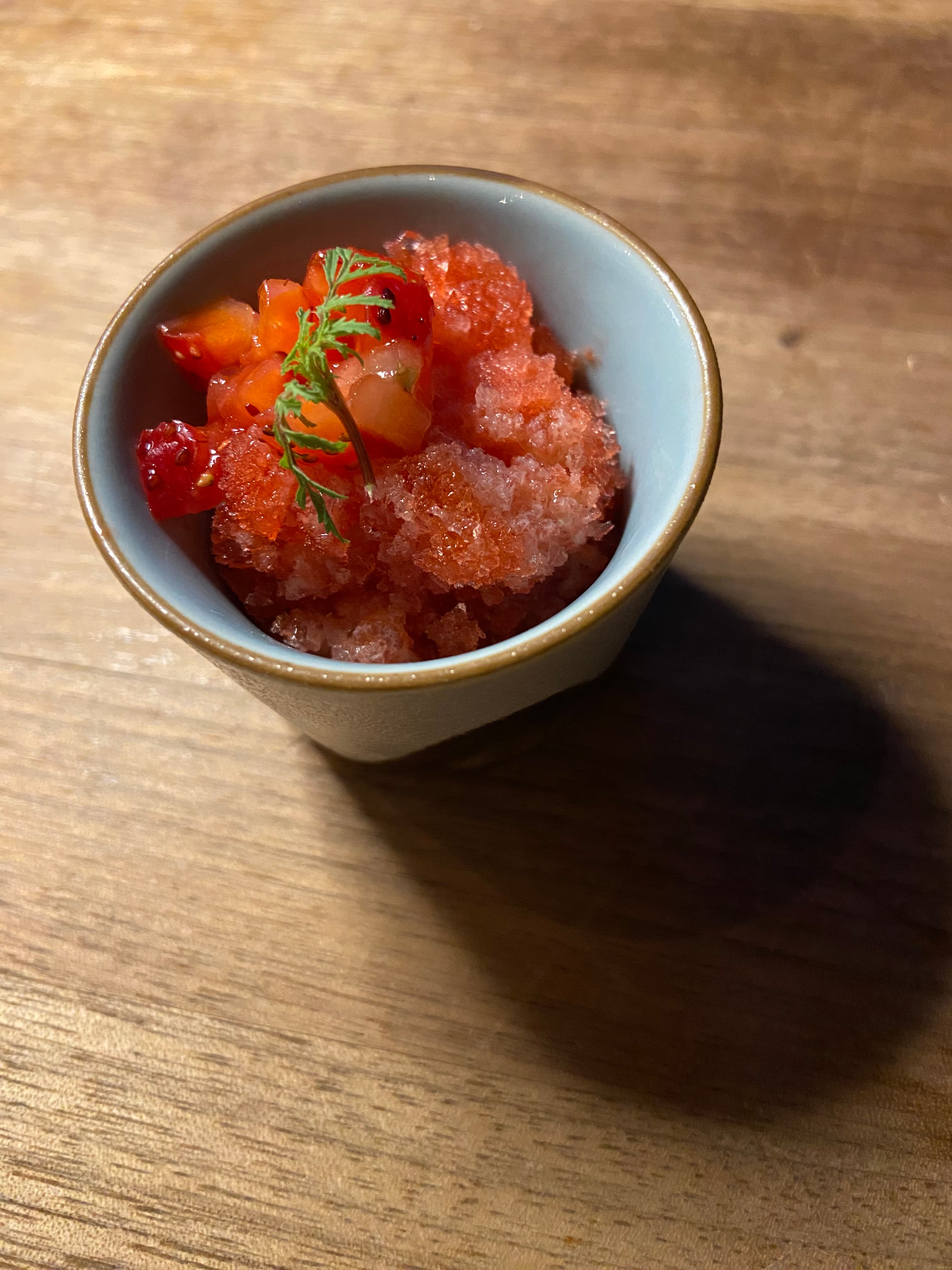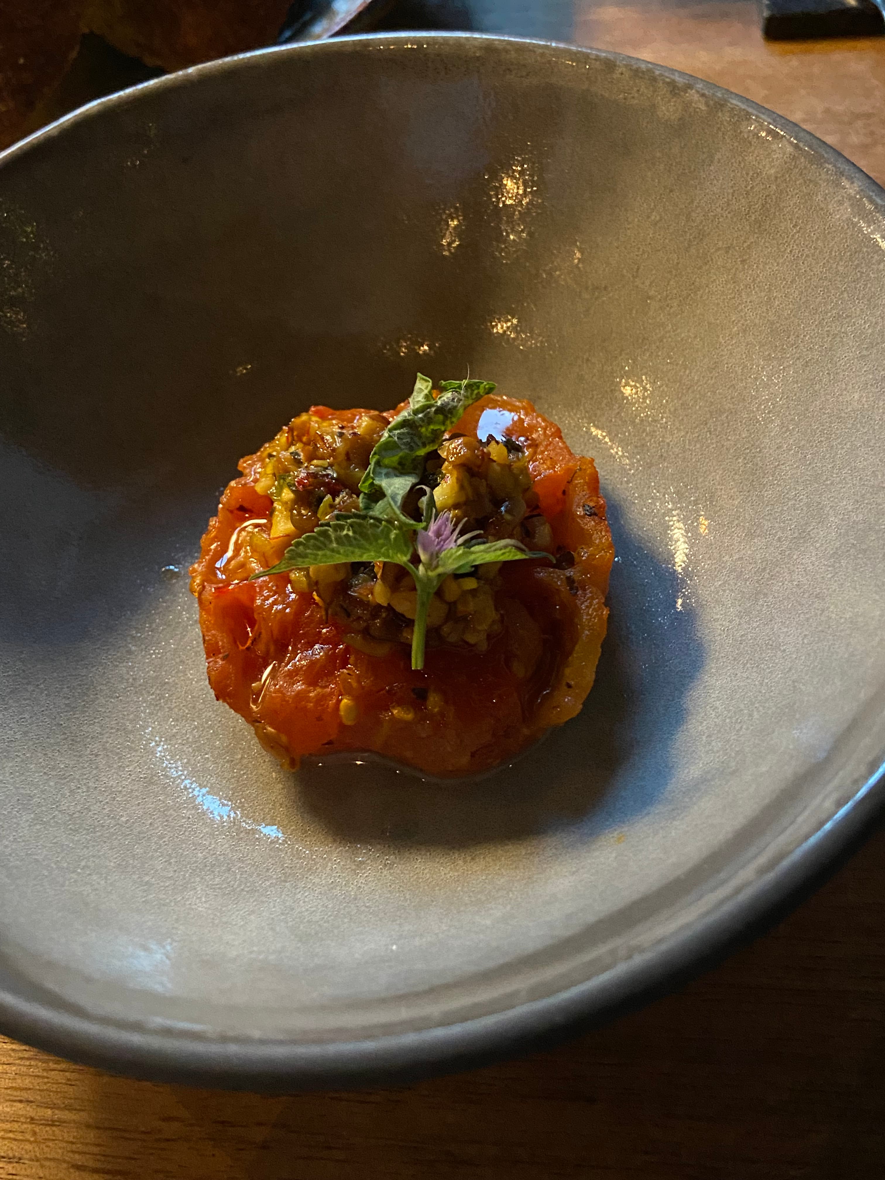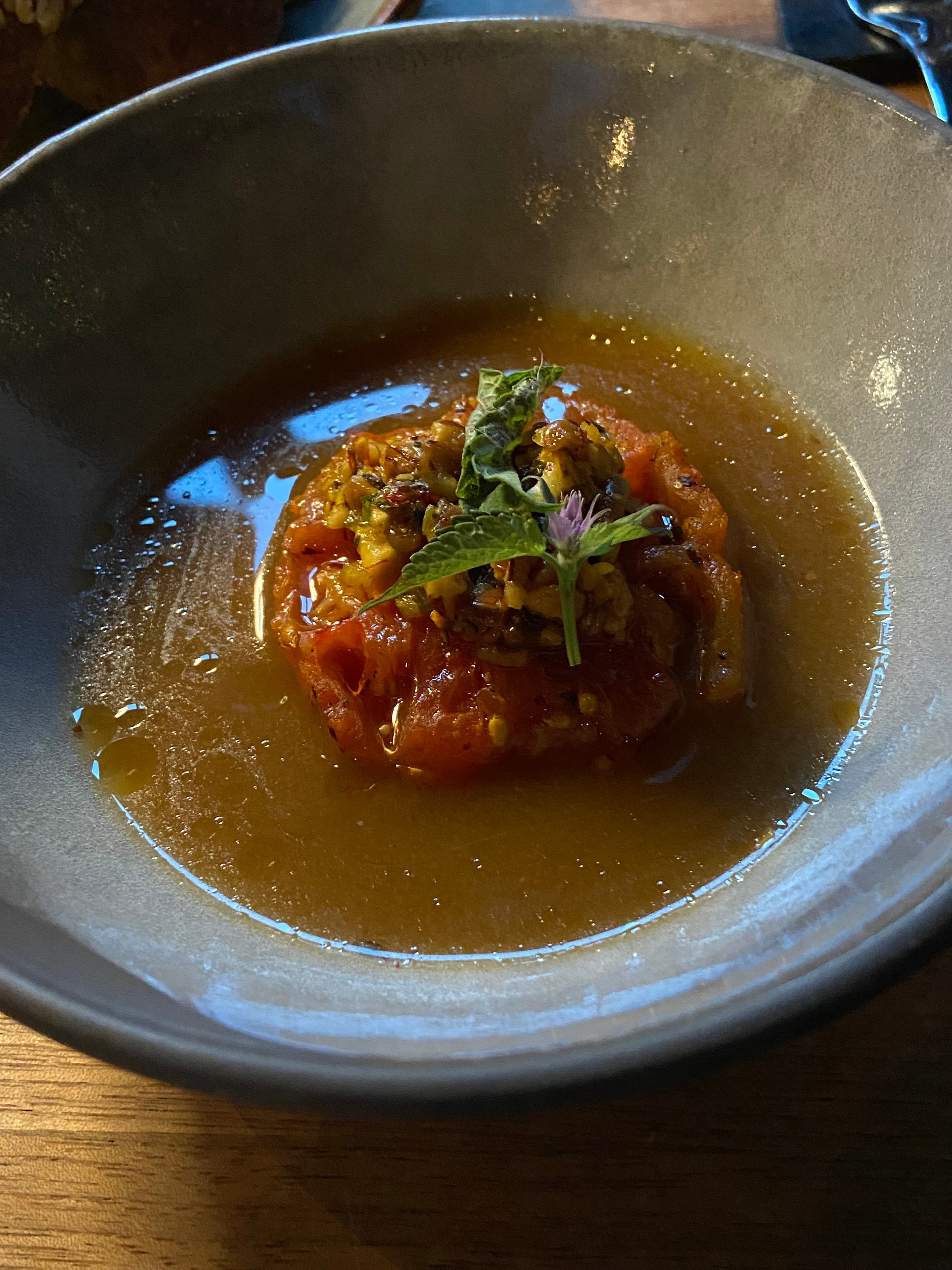 Charcoal grilled tomato, aromatic tomato broth, Cap Tourmente hazelnut condiment