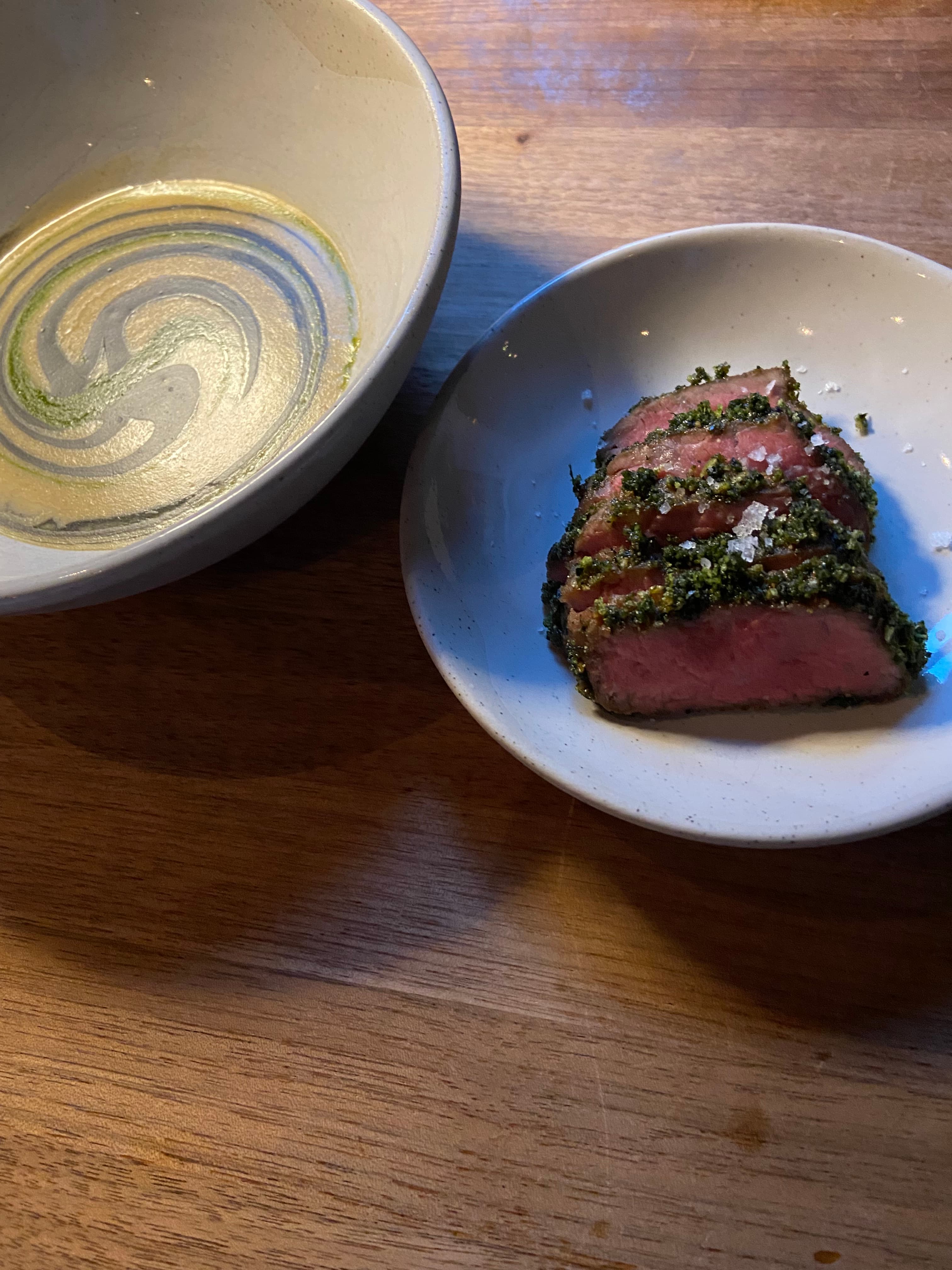 Koji-aged beef steak, herb crust, caraway honey, coal and chanterelles sauce, herbs sauce, potato sauce