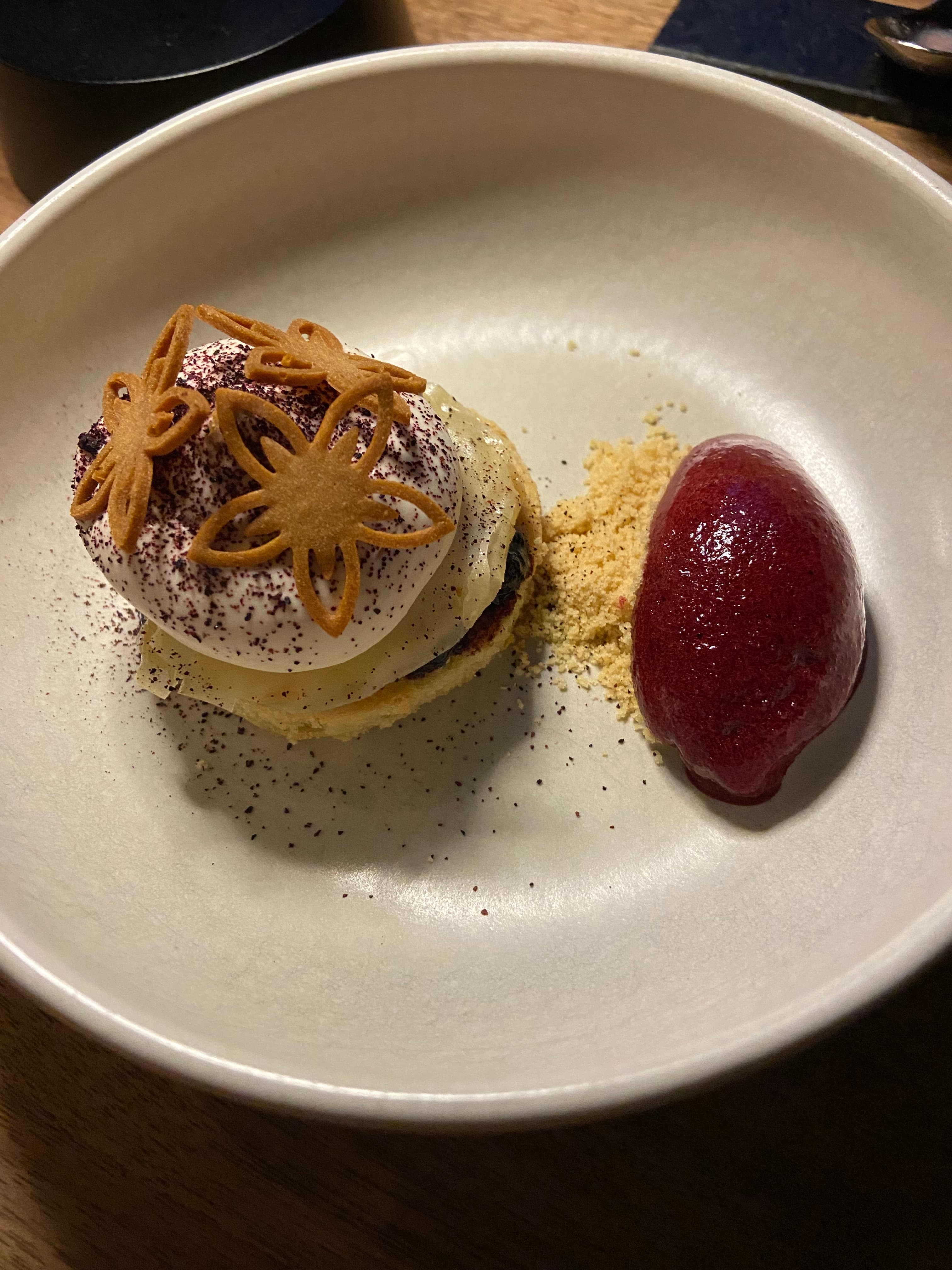 Honey cake, thuja cone mascarpone creme, haskap sorbet, haskap compote, honey tuille