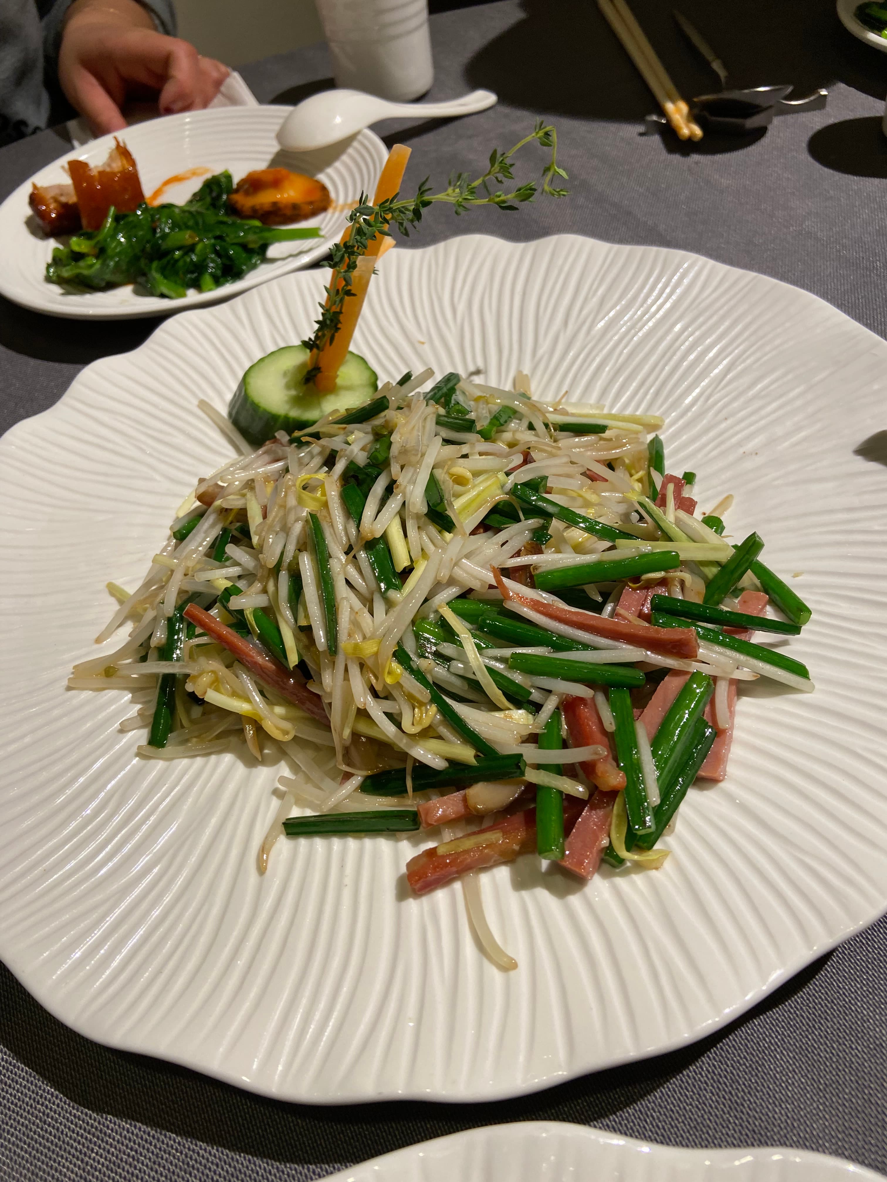 Stir fried flowering chives, Bean Sprouts, Shitake Mushroom and Chinese Hunan Ham ( Lovely textural interplay. Crunchy, chewy, salty and savory )
