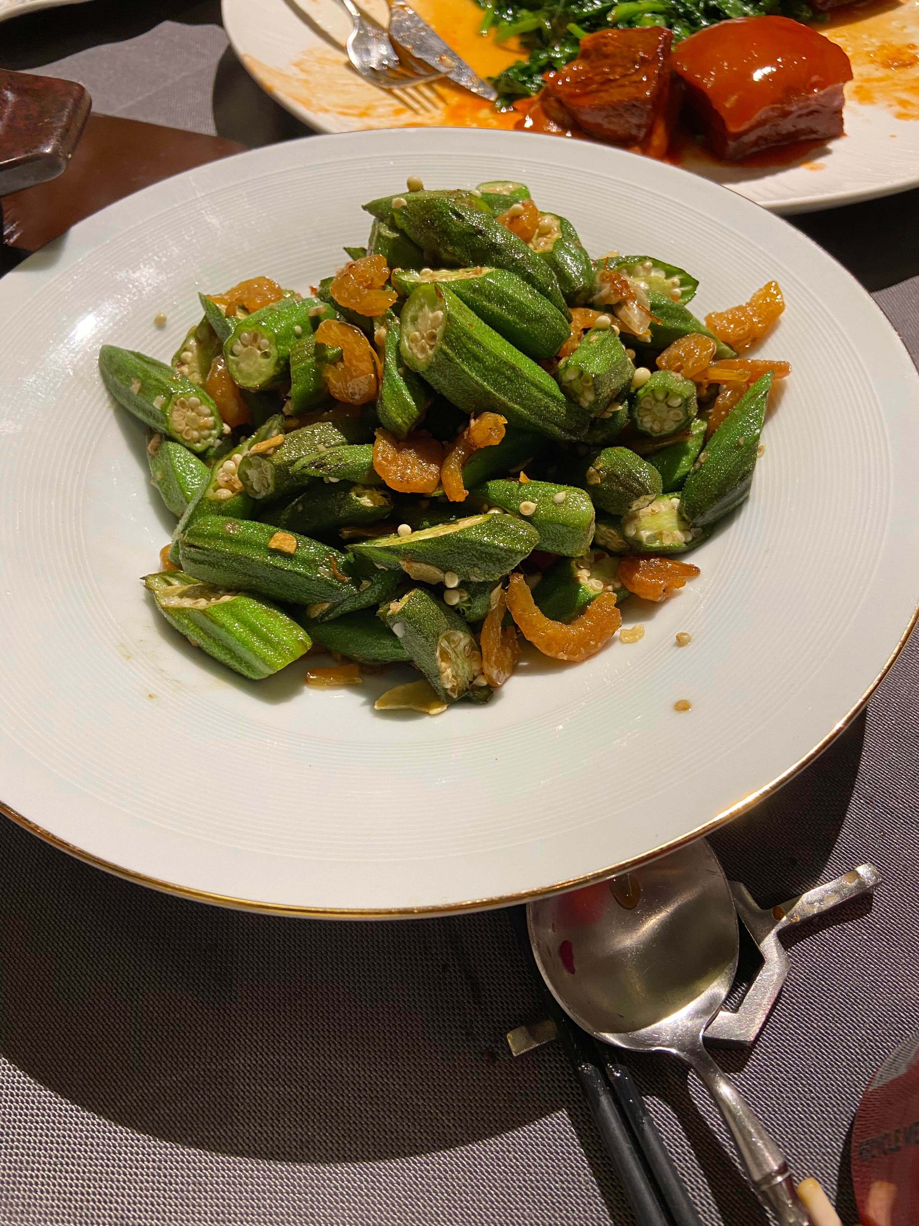 Belanchan and dried shrimp stir-fried Okra ( Sensational! Lots of smokey wok-hay. As a Chinese vegetarian dish. Tasty and different! )