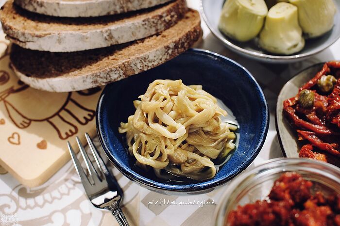 Wanted to have a go at making pickled aubergine like I had in Sicily. I used a vegetable peeler to make strips. Next time I will cut it thickly so no more peeler.
