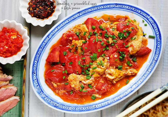 Vietnamese-style scrambled eggs with very ripe tomatoes I saved especially for this dish. (Chinese-style has soya sauce, and a drop of sesame oil)