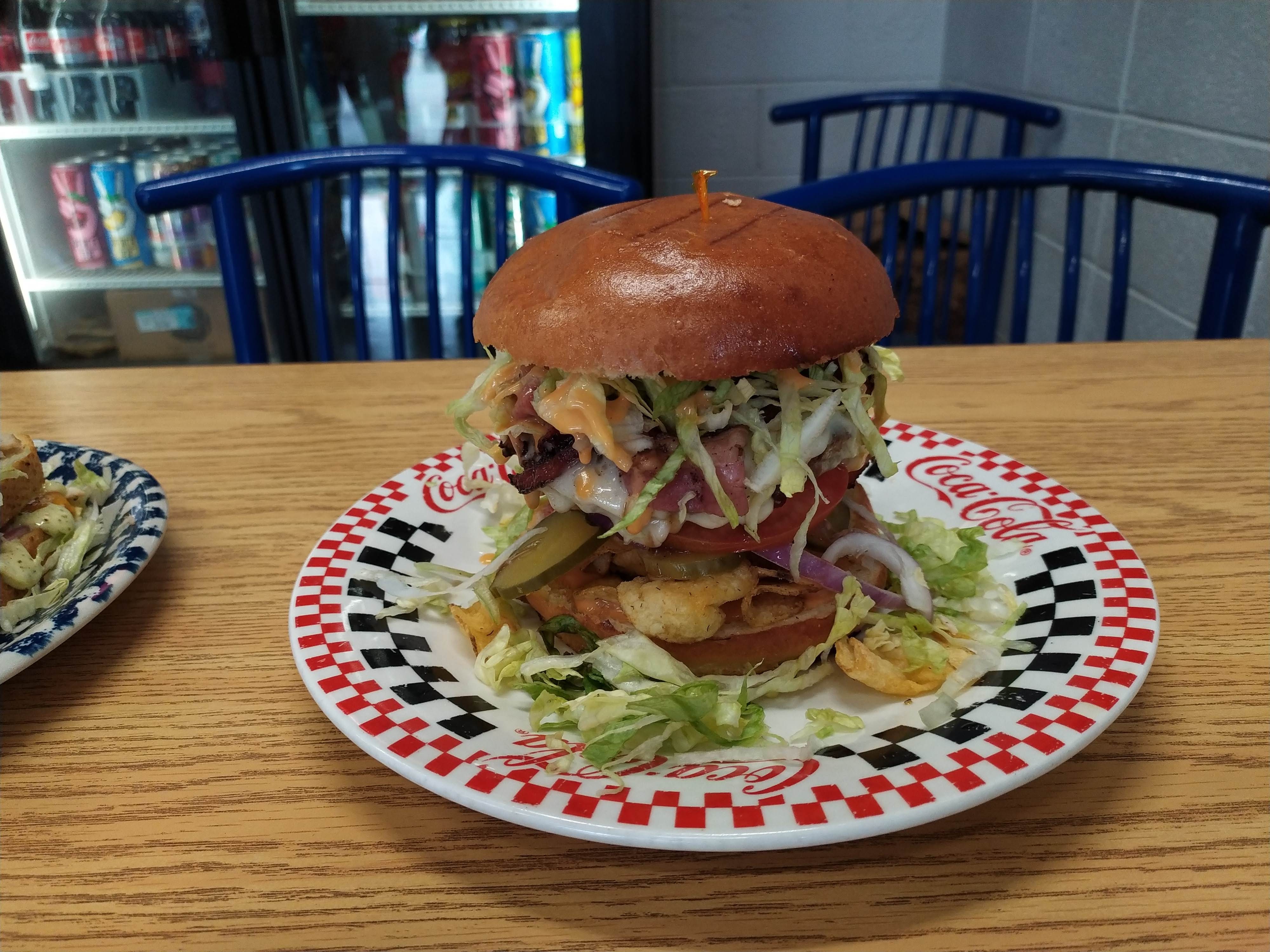 This giant of a burger is called an East coast burger at a place called lucky Miller’s deli in Redding California. It has a special oil bun with New York pastrami provolone cheese and the burger is made with lean 80% Angus 20% wagyu fat and on the bottom are Dill kettle chips.
