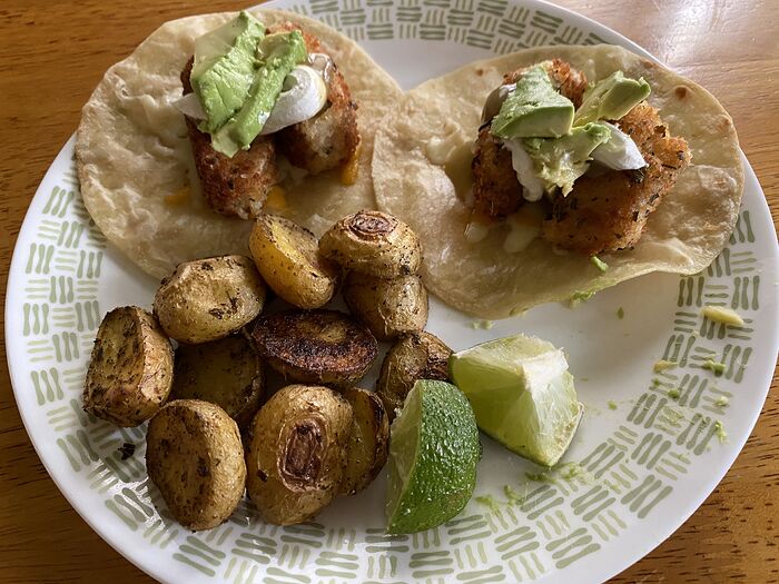 Started out fixing a tray of roasted Yukon minis for the week and then cleaning some fresh tilapia which quickly translated into a fish taco lunch.