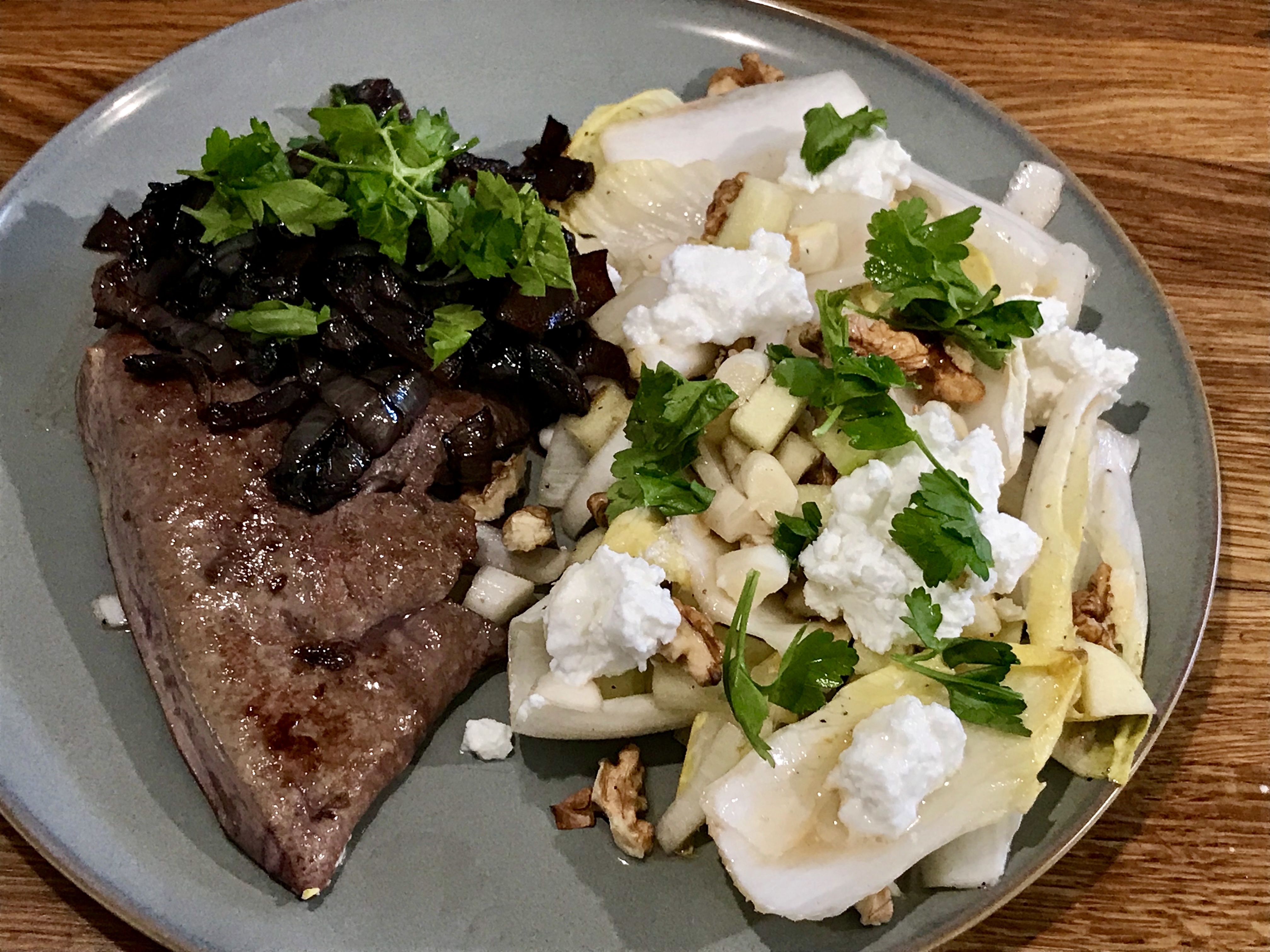 Veal liver with balsamic onion confit. Winter salad endive, walnut, apple and hazelnut oil.
