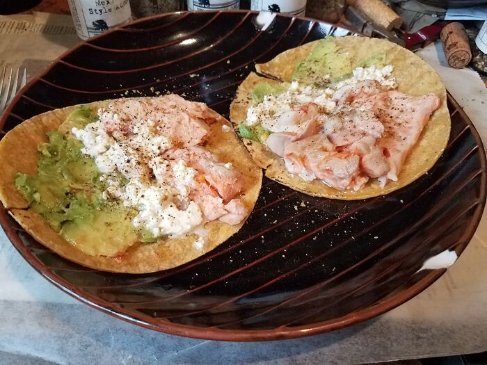 Salmon. Two local stores sell salmon trim for about half price, $9-10/lb. I get a half pound every week and sous-vide it to 120F for 45 minutes, and make ramen (see a few replies up) and the fish tacos, sometimes fried rice. It doesn’t photograph well, but it’s very tasty.