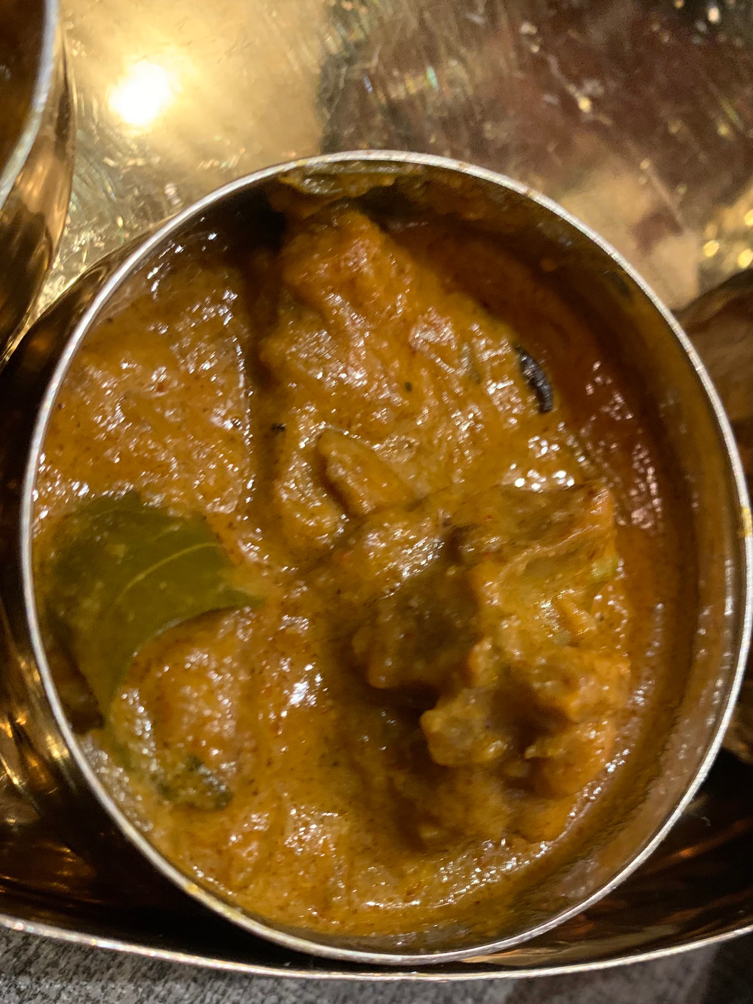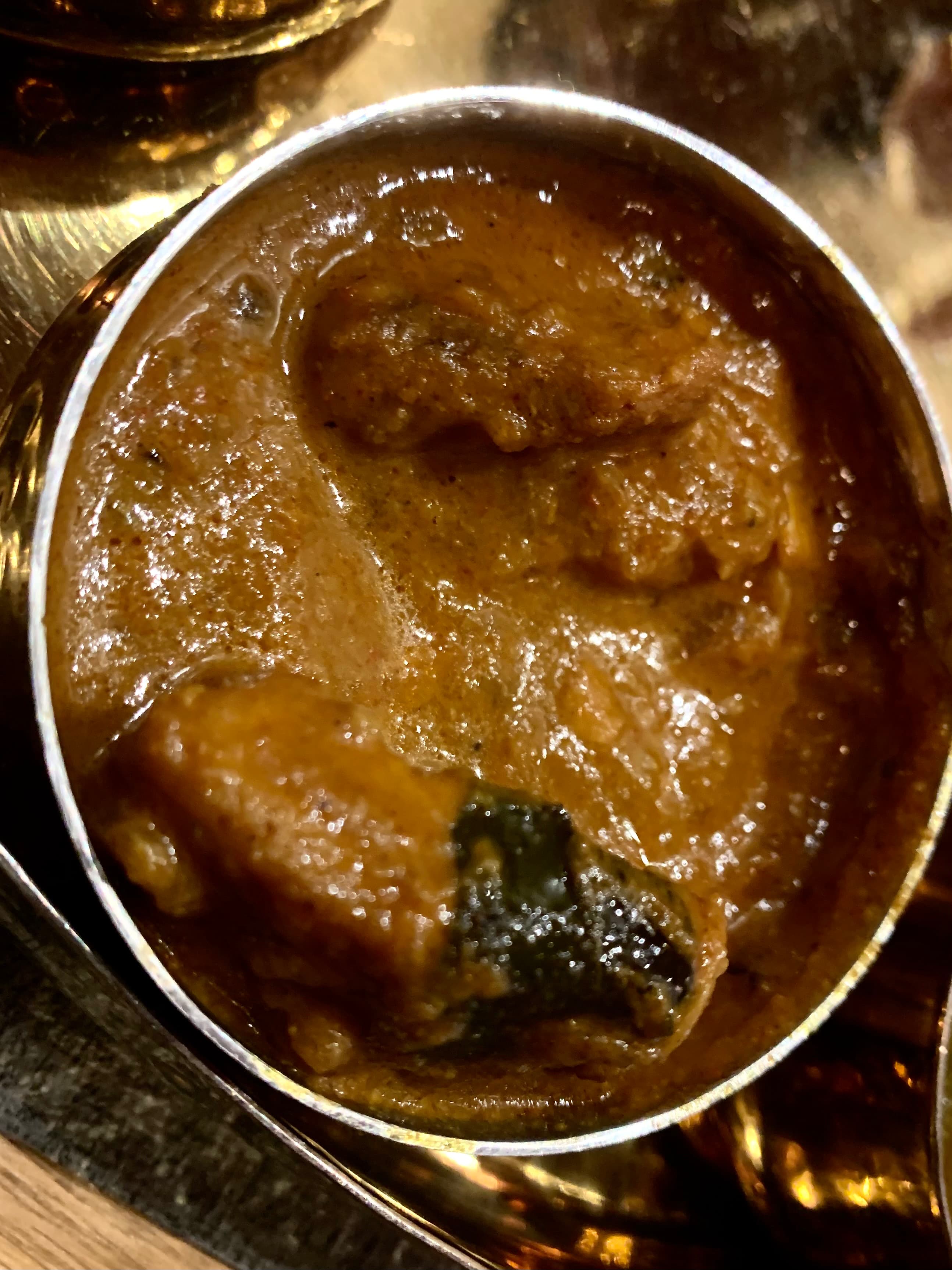 2 mains — fish curry, prawn masala which we swapped because of an allergy, chicken curry, and mutton / goat masala