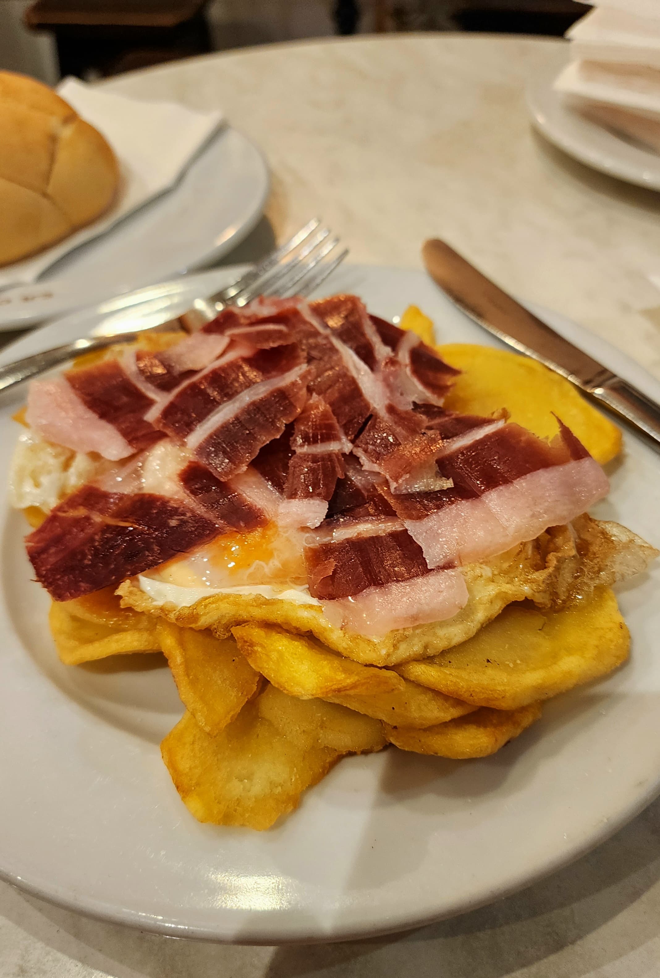 Had a decent bocadillo con jamon at an open air park cafe. Not bad and the view of trees was great.