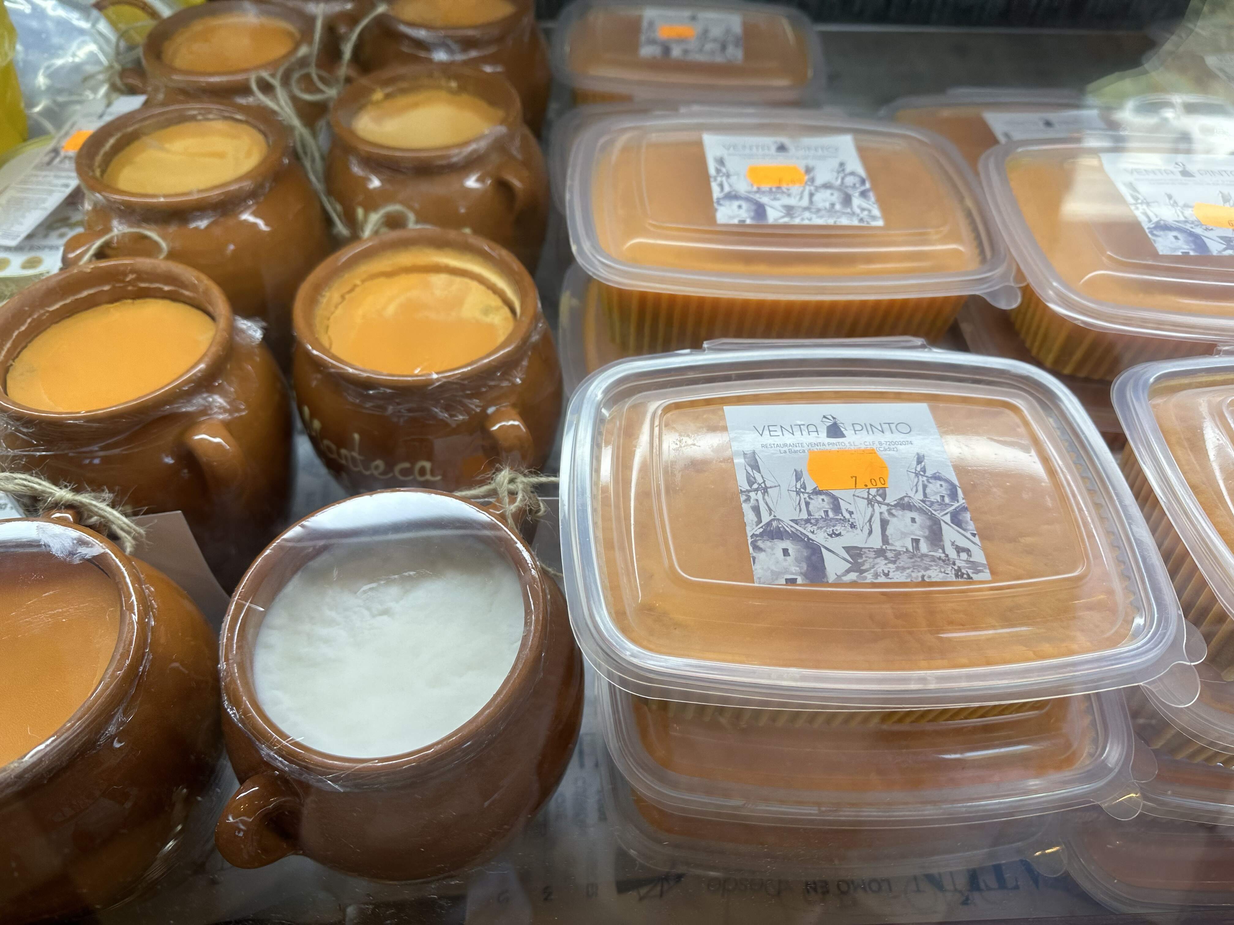Unlike the Tuscan lard, which its presented as a solid block for slicing, the red lard of La Janda is usually sold in terra cotta jars from which you scoop out portions with a spoon. (I think this is true).