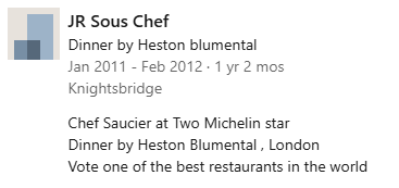 Close; here’s his LinkedIn profile. He in fact worked at Blumenthal’s London restaurant, Dinner. (Still pretty impressive…but only 2 stars, so not quite up to pub standards )