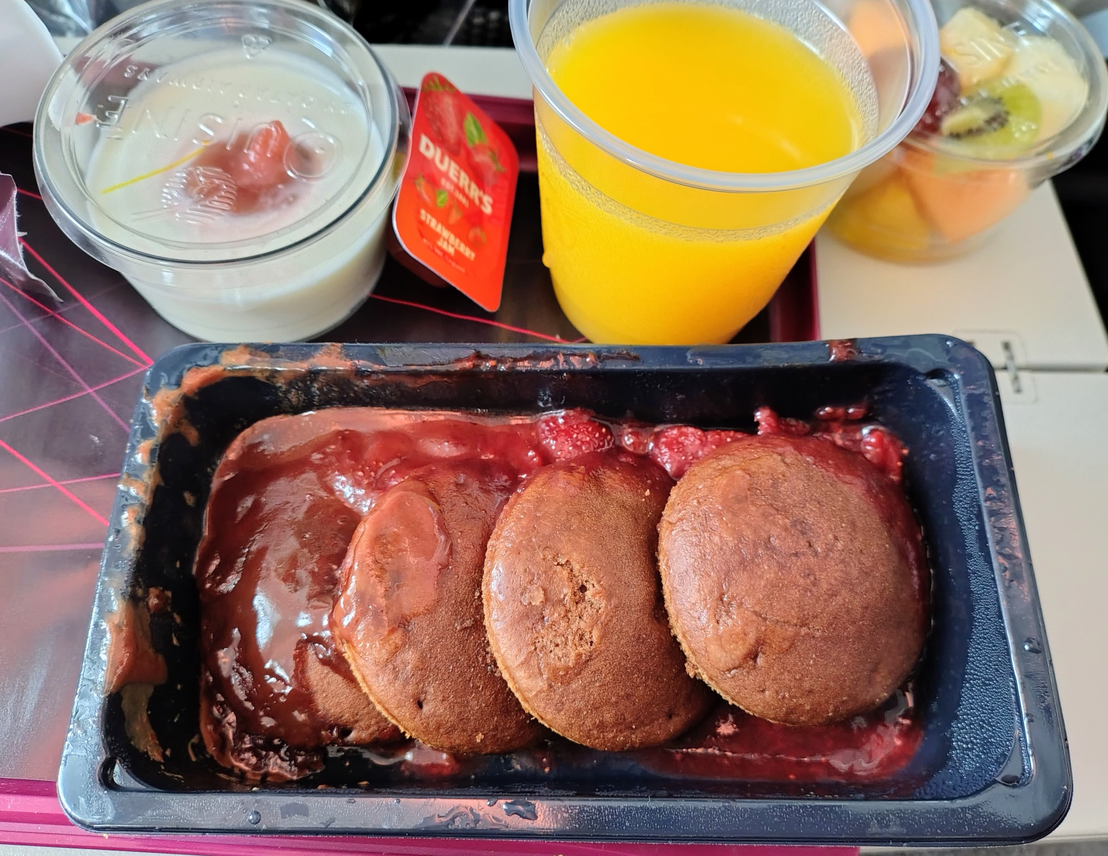 London to Qatar on Qatar Airways - early morning departure. Choices at breakfast were: chicken noodle stir-fry, frittata or chocolate pancakes with strawberry compote. I often get nauseous on planes and I hadn’t eaten anything since I woke up at 3am, so I thought I should probably eat something. The pancakes seemed like the only thing I could keep down. They were ok. I scraped the chocolate sauce and compote off.